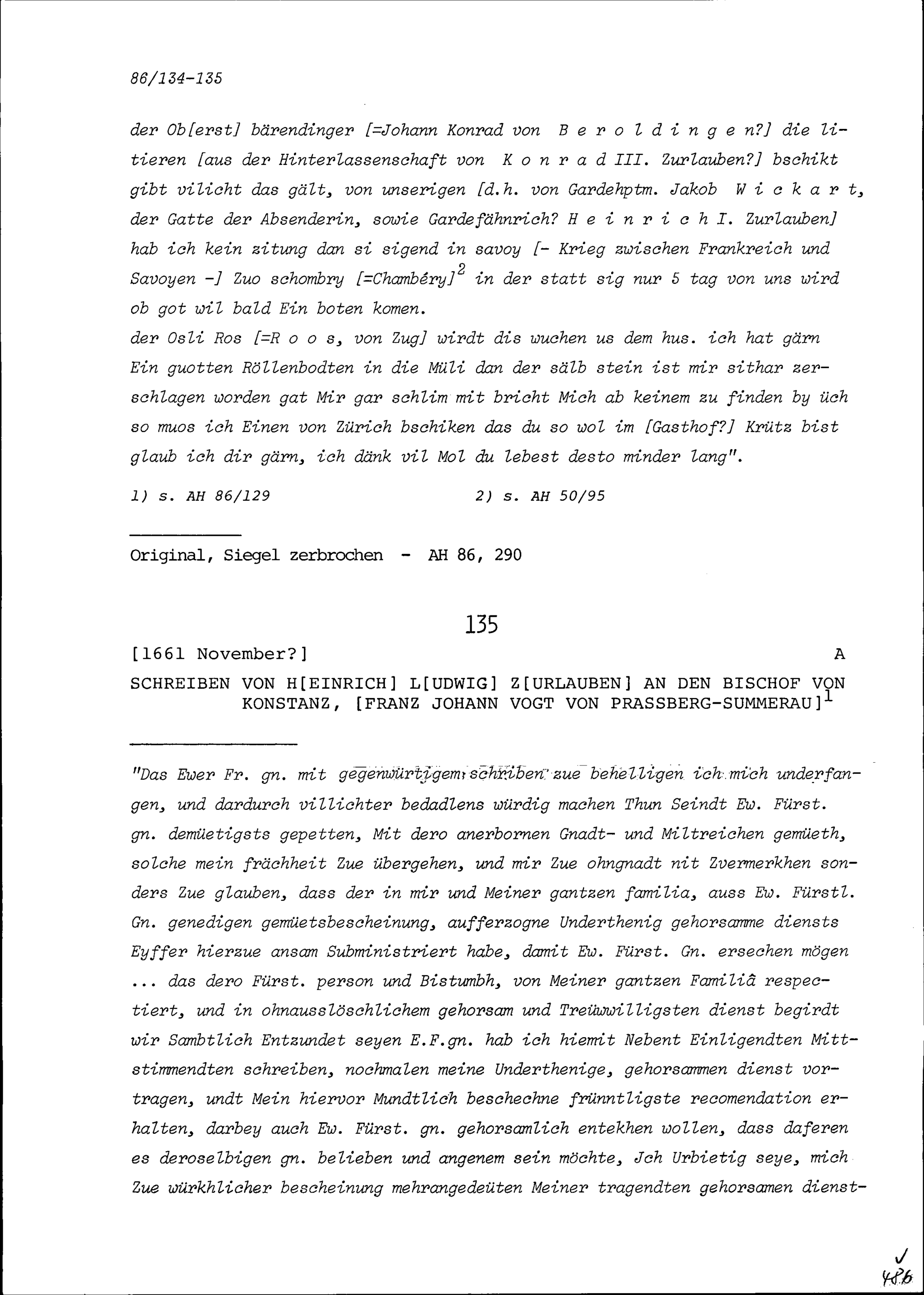 Schreiben von Heinrich Ludwig Zurlauben an Franz Johann Vogt von Prassberg-Summerau, Bischof von Konstanz