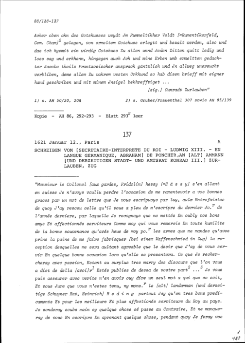 Schreiben von Abraham de Poncher, französischer Dolmetscher, an Konrad III. Zurlauben,...