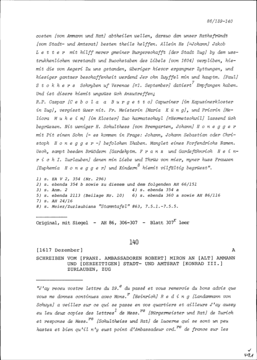 Schreiben von Robert Miron, Ambassador von Frankreich, an Konrad III. Zurlauben,...
