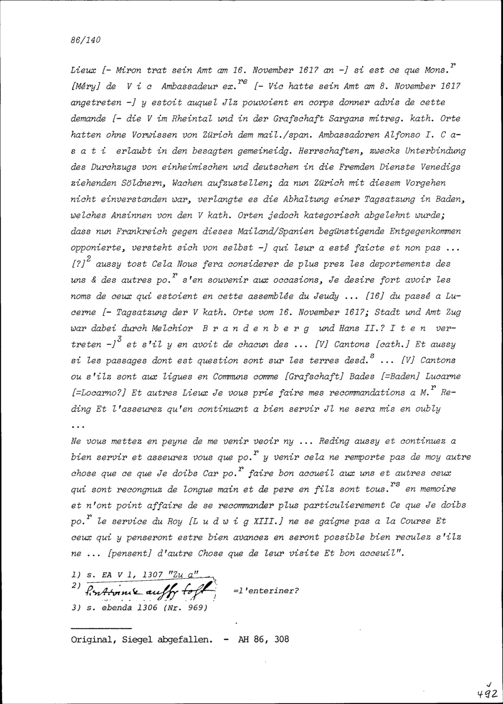 Schreiben von Robert Miron, Ambassador von Frankreich, an Konrad III. Zurlauben,...
