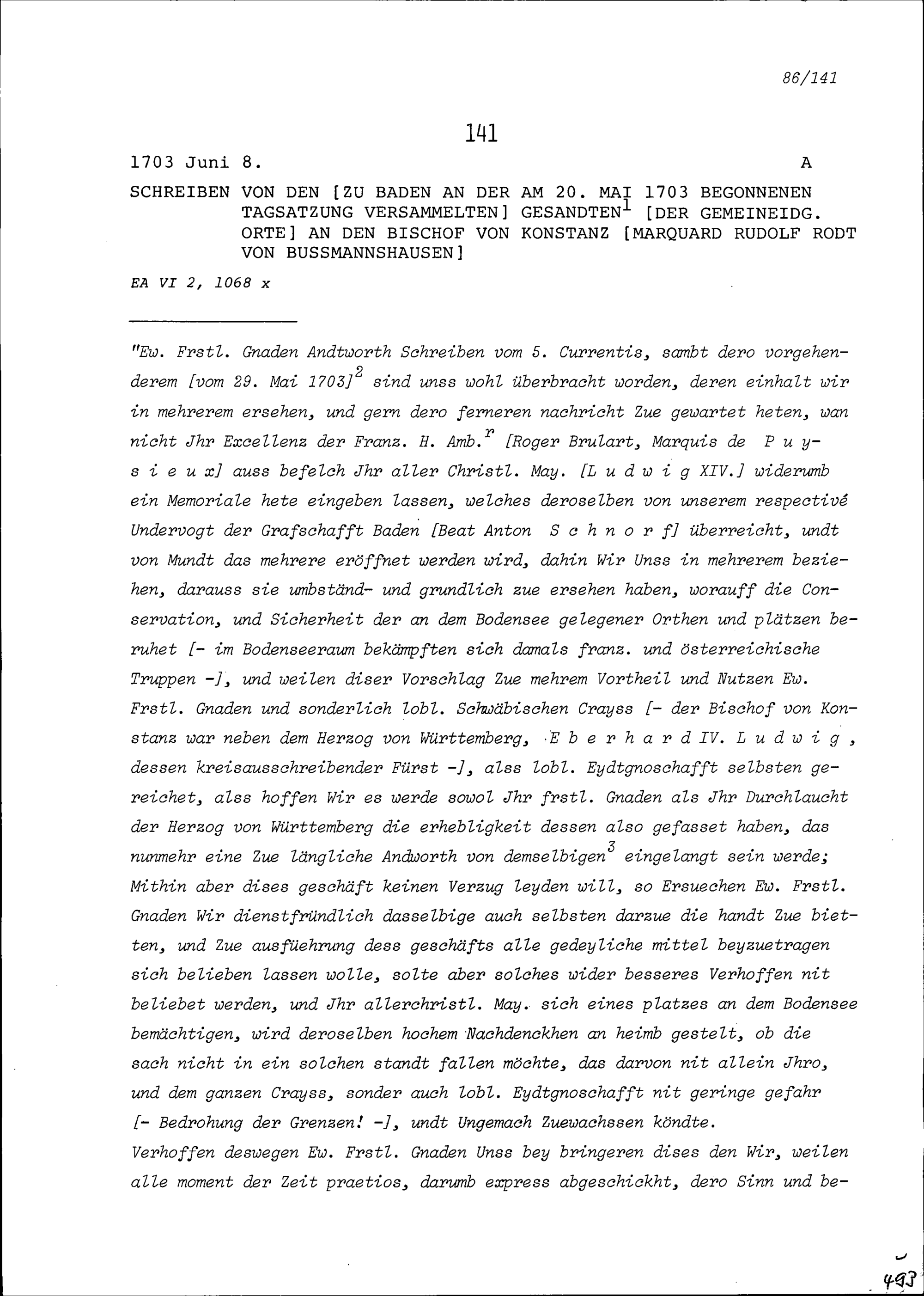 Schreiben der Gesandten zu Baden der Tagsatzung vom 20. Mai 1703 an Marquard Rudolf Rodt von Bausmannshausen, Bischof von Konstanz