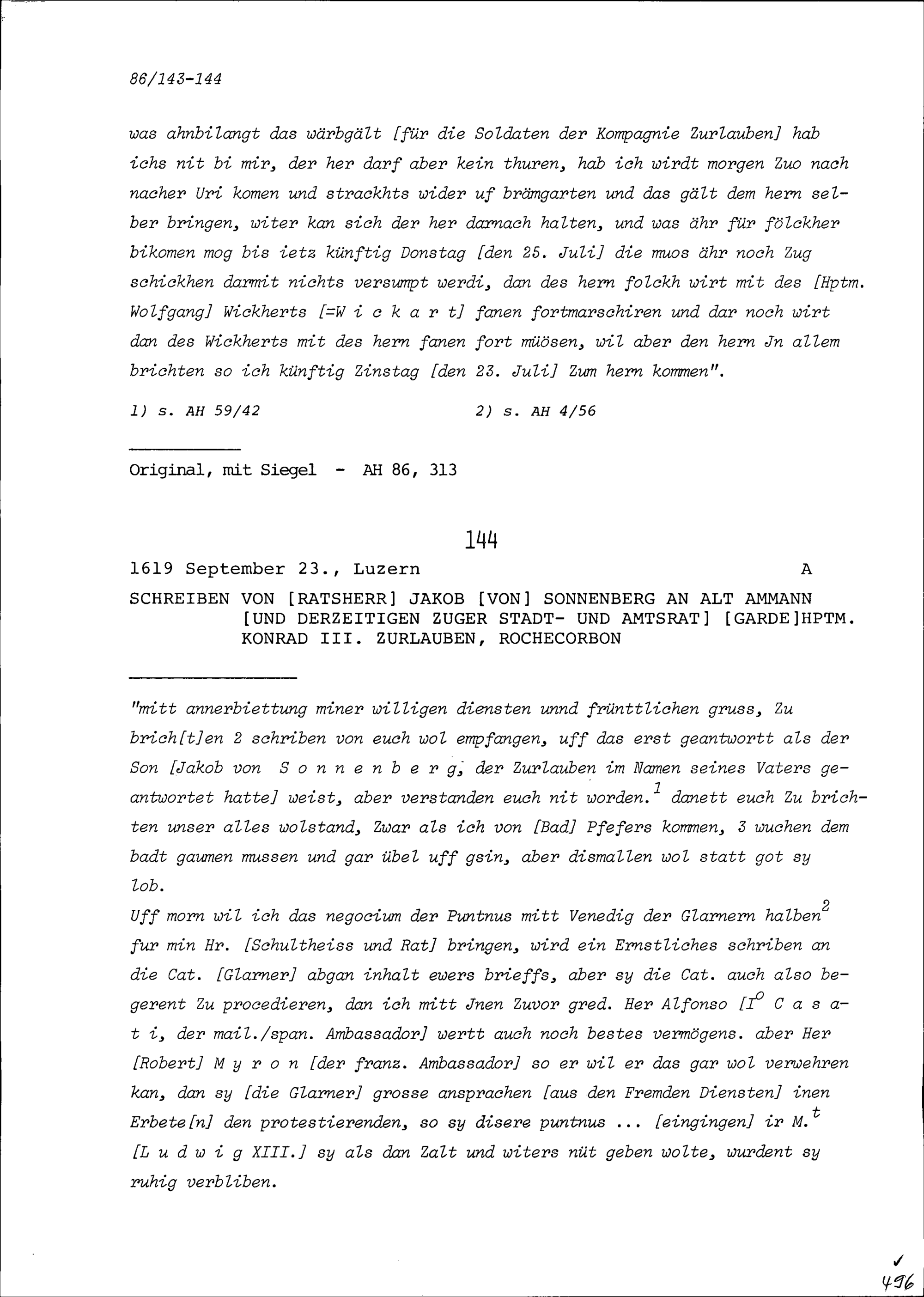 Schreiben von Jakob von Sonnenberg, Ratsherr an Konrad III. Zurlauben, Altammann und Stadt- und Amtrat Zug und Gardehauptmann, Rochecorbon