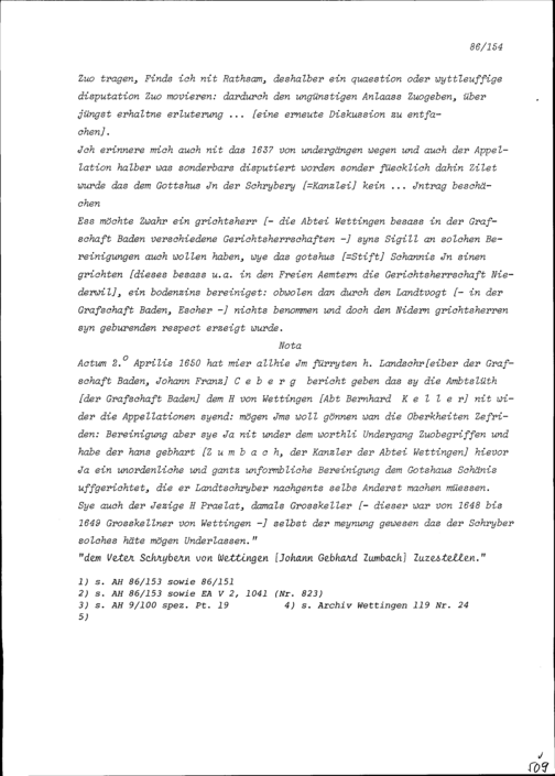 Gutachten von Beat II. Zurlauben, Stadt- und Amtrat Zug, über Rechtsstreitigkeiten zwischen der Abtei Wettingen einerseits und der Grafschaft Baden anderseits