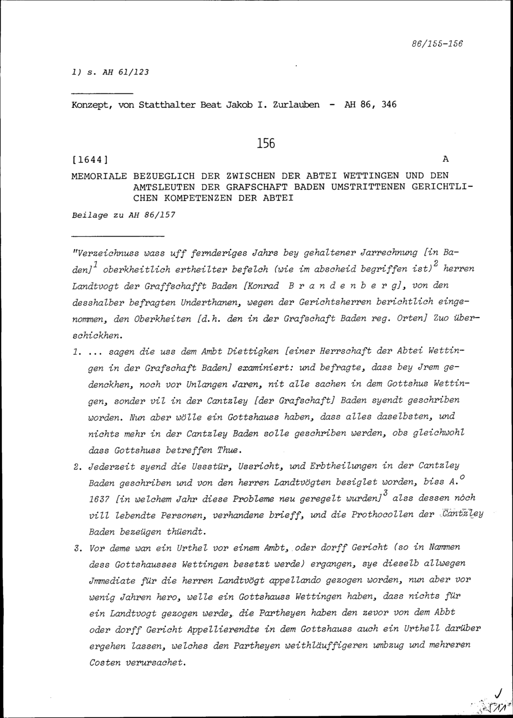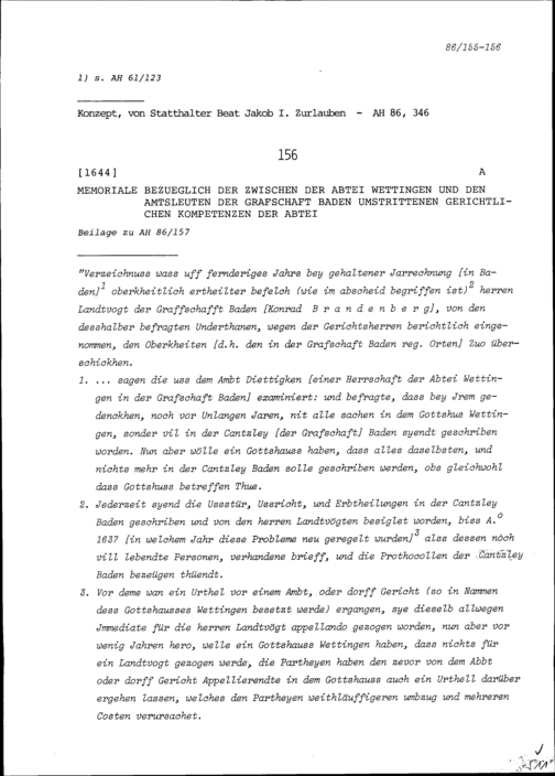 Bericht bezüglich der zwischen der Abtei Wettingen und den Amtsleuten der Grafschaft Baden umstrittenen gerichtlichen Kompetenzen der Abtei