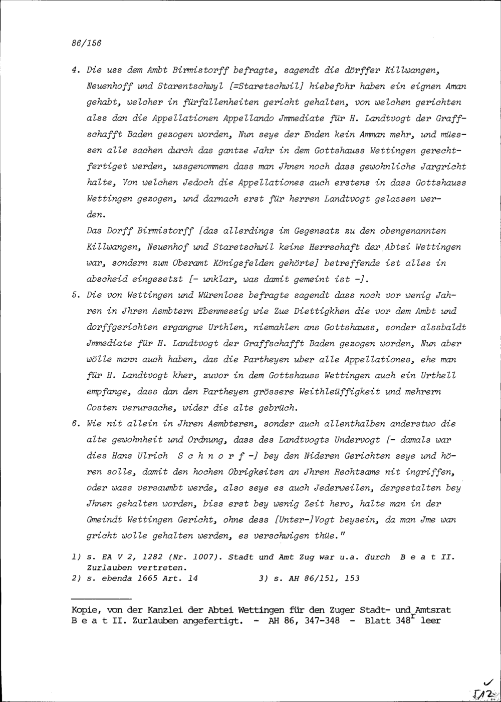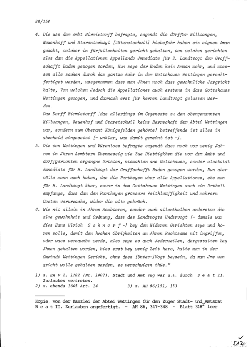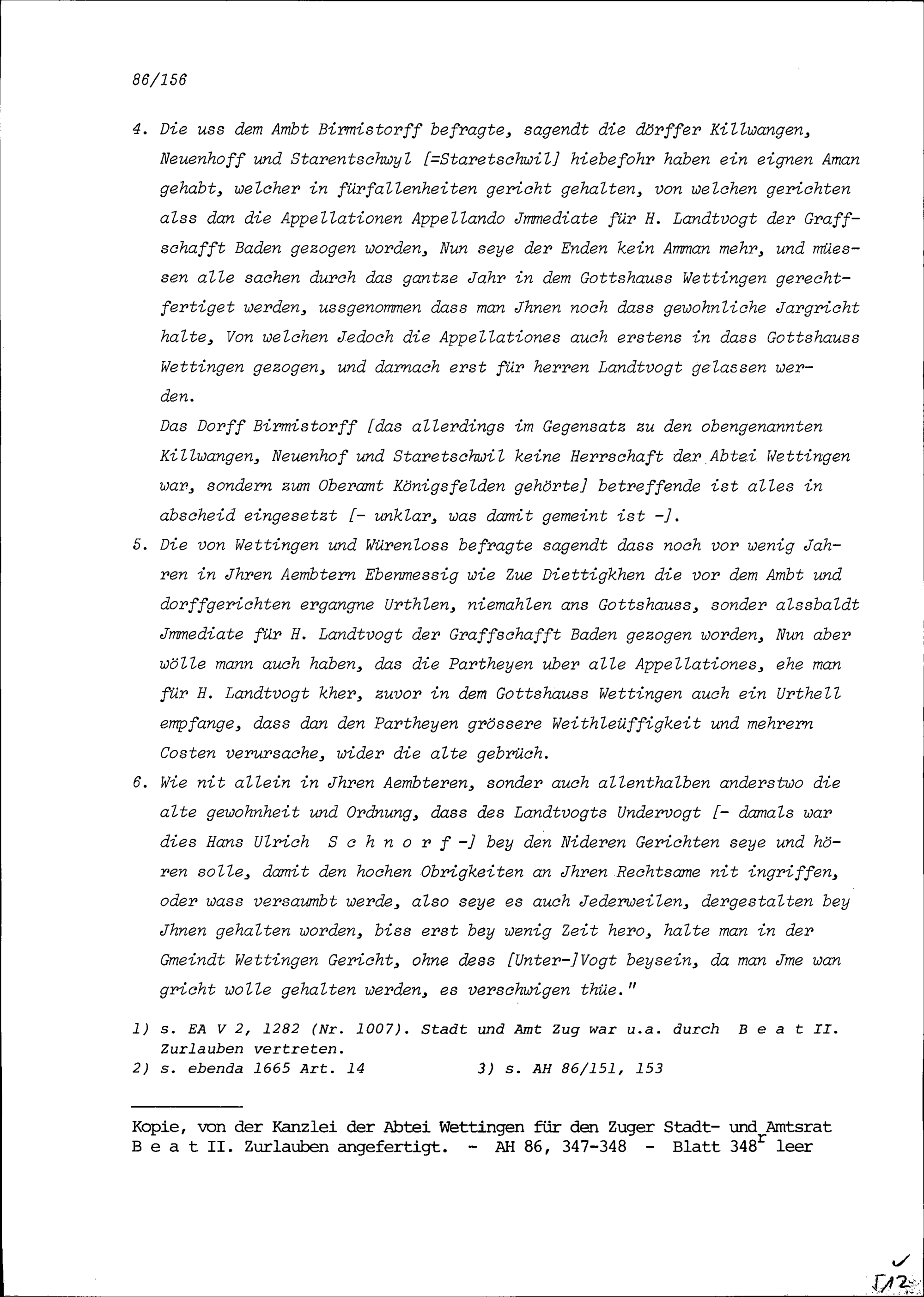 Bericht bezüglich der zwischen der Abtei Wettingen und den Amtsleuten der Grafschaft Baden umstrittenen gerichtlichen Kompetenzen der Abtei