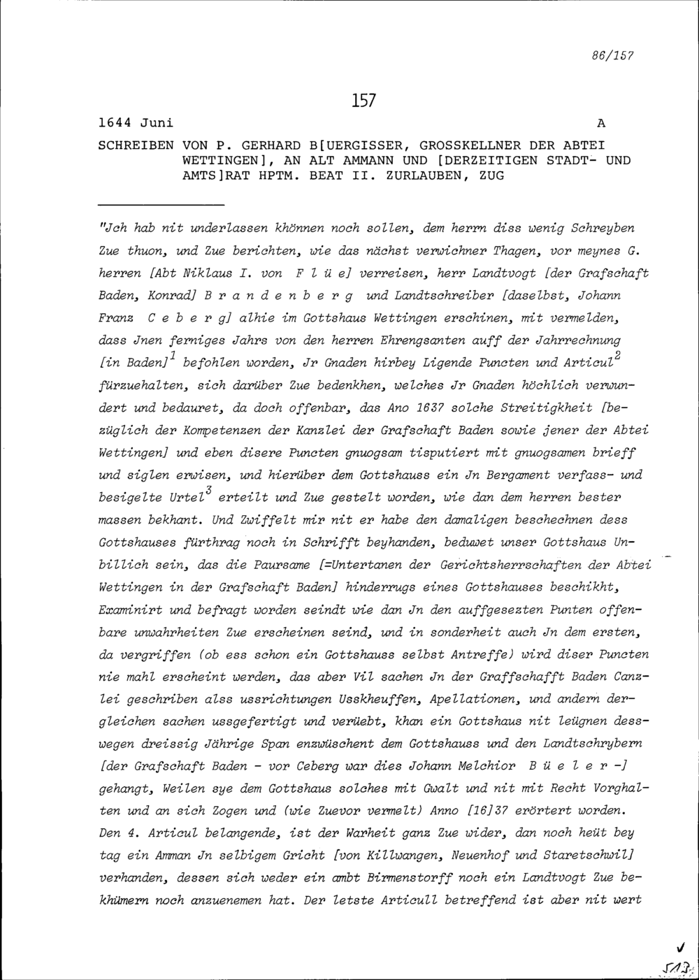 Schreiben von Gerhard Bürgisser, Konventuale und Grosskellner der Abtei Wettingen, an Beat II. Zurlauben, Hauptmann und Stadt- und Amtrat, Zug