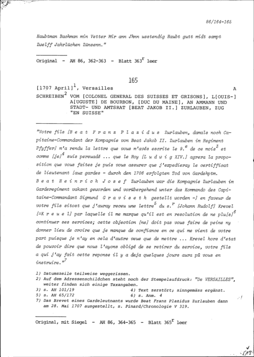 Schreiben von Louis-Auguste de Bourbon, Duc du Maine, Kommandant des Regiments der Schweizer und Bündner Garden, an Beat Jakob II. Zurlauben, Ammann und Stadt- und Amtrat, Zug
