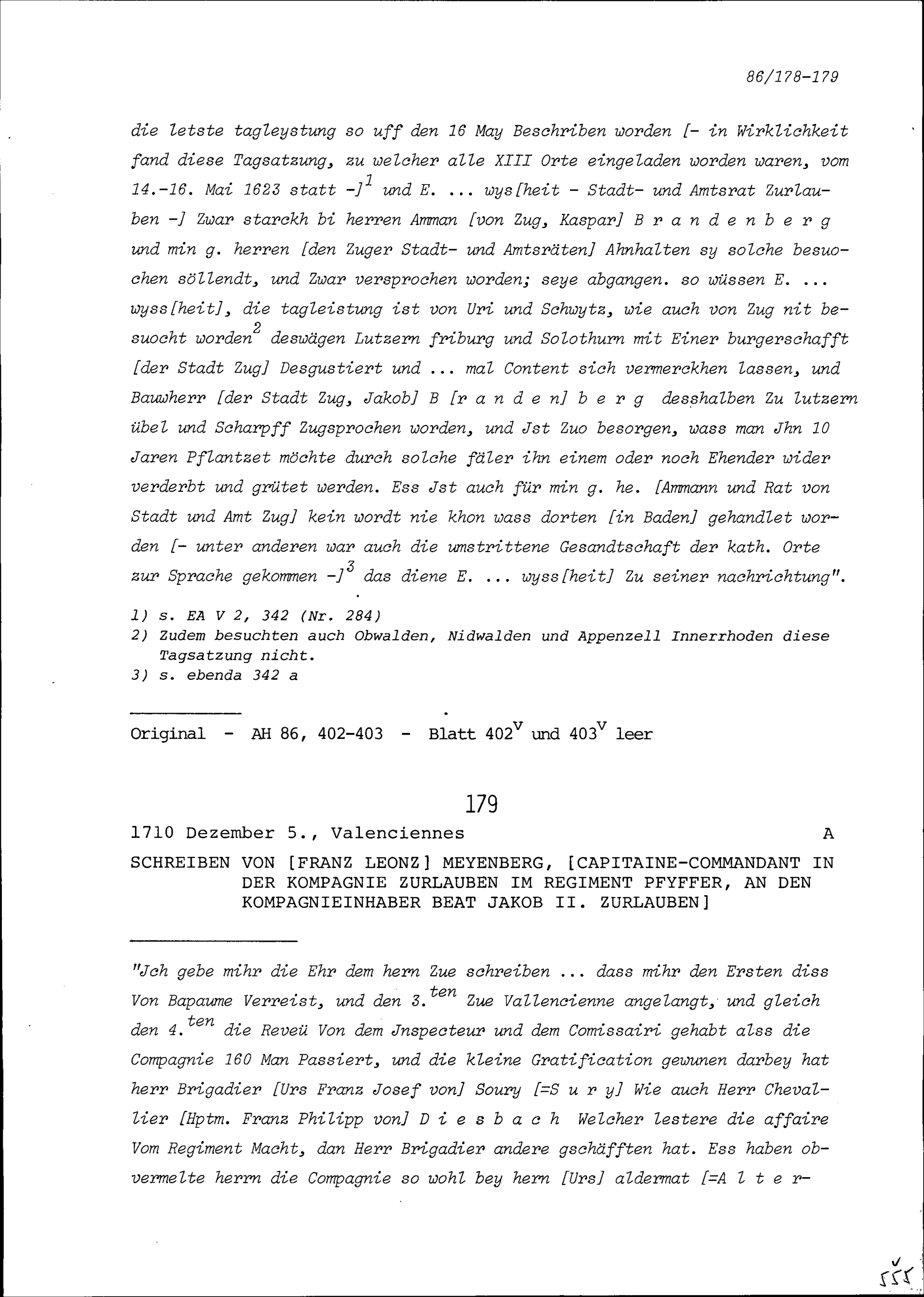 Schreiben von Franz Leonz Meyenberg, Kommandant in der Kompanie Zurlauben im Regiment Pfyffer, an Beat Jakob II. Zurlauben, Kompanieinhaber