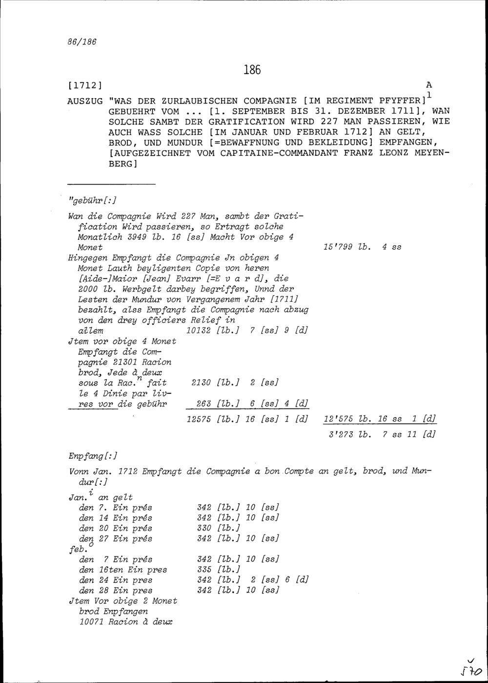 Abrechnung für die Kompanie Zurlauben für Gratifikation, Sold, Brot und Montur, aufgezeichnet von Franz Leonz Meyenberg, Kommandant