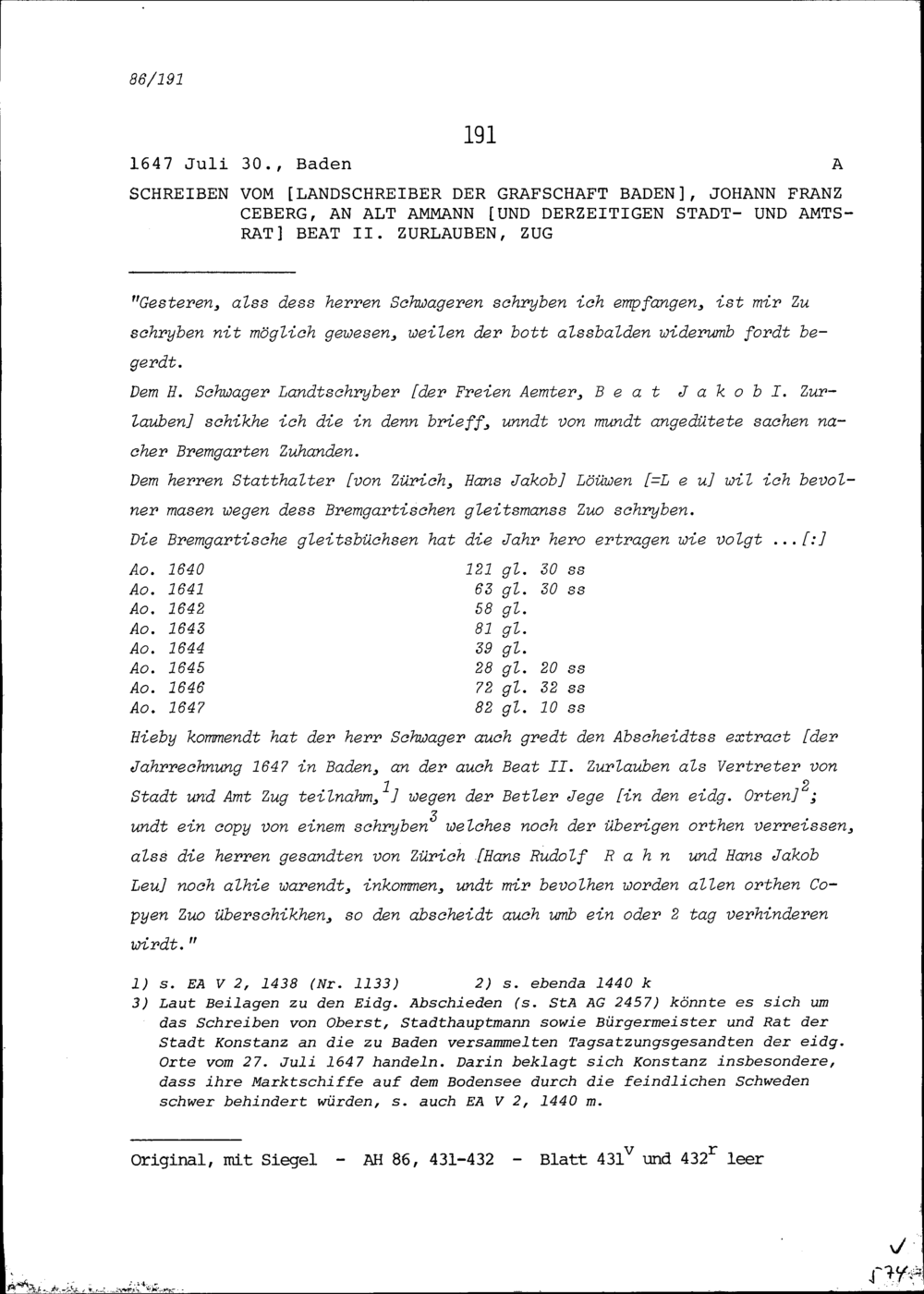 Schreiben von Johann Franz Ceberg, Landschreiber der Grafschaft Baden, an Beat II....