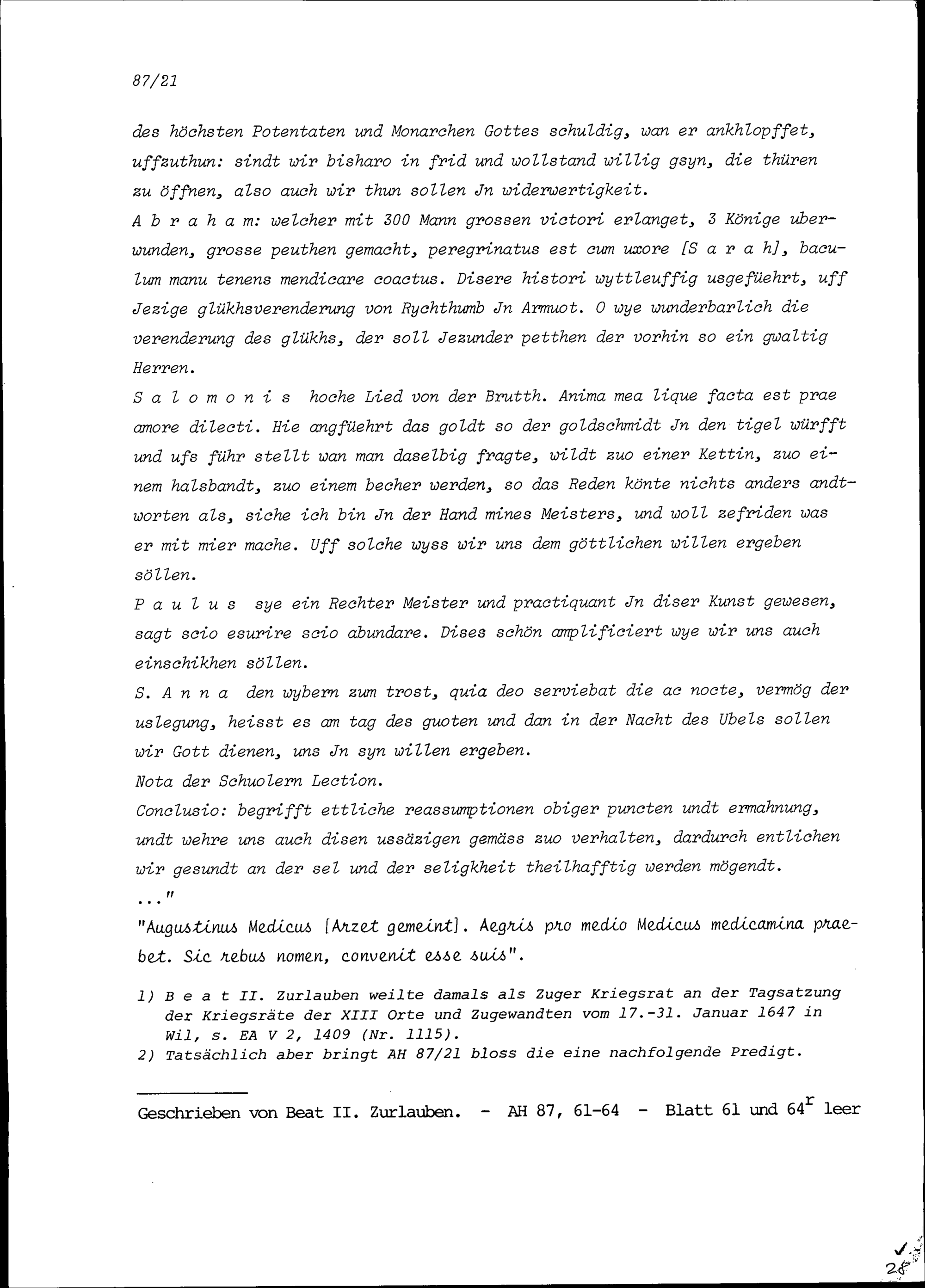 Kompendium einer Audienz (Predigt) von Augustinus NN, Prämonstratenserpater und Arzt in Konstanz aufgezeichnet von Beat II. Zurlauben