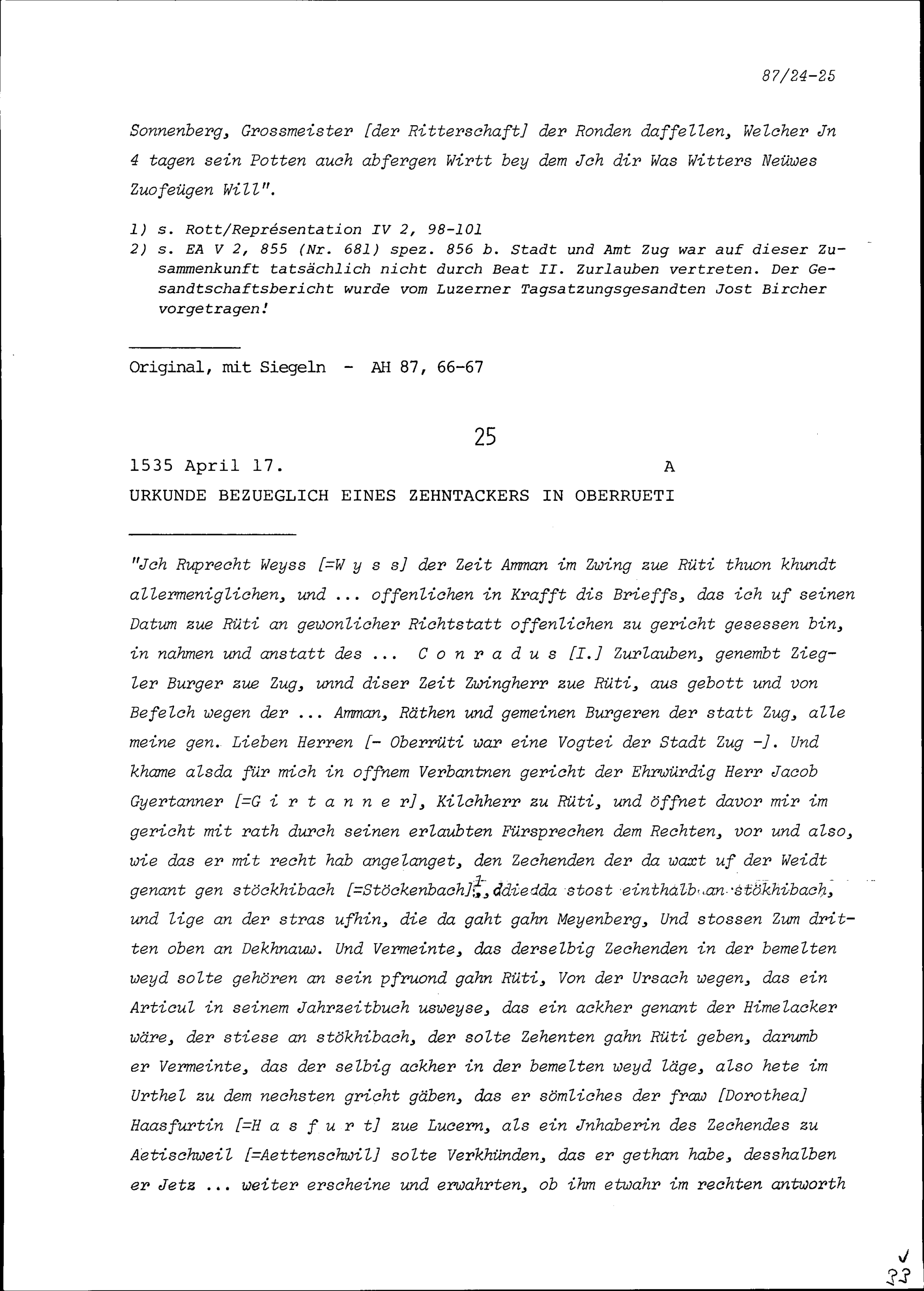 Urkunde bezüglich eines Zehntackers in Oberrüti