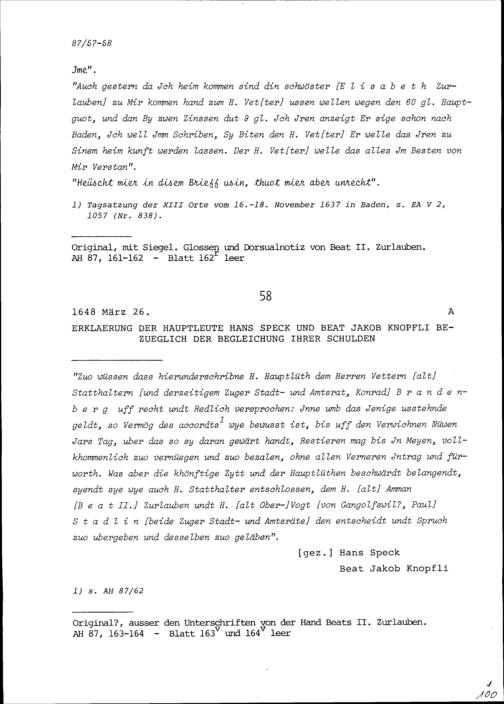 Erklärung von Hans Speck, Hauptmann, und Beat Jakob Knopfli, Hauptmann, wegen ihrer Schulden