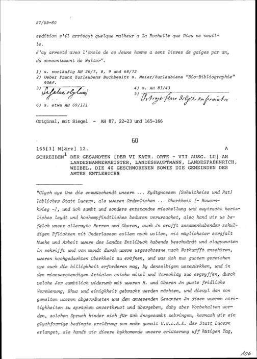 Schreiben der Gesandten der Sechs Katholischen Orte an Landesbannermeister, Landeshauptmann, Landesfähnrich, Weibel und die 40 Geschworenen sowie die Gemeinden des Amts Entlebuch