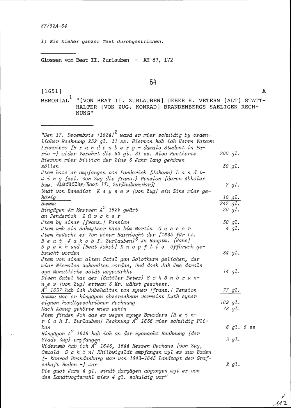 Bericht von Beat II. Zurlauben über die Rechnung von Konrad Brandenberg, Altstatthalter von Zug, selig