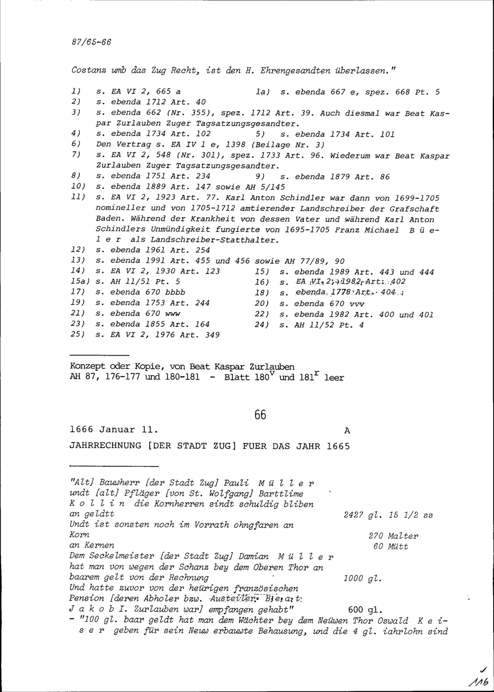 Jahrrechnung der Stadt Zug für das Jahr 1665