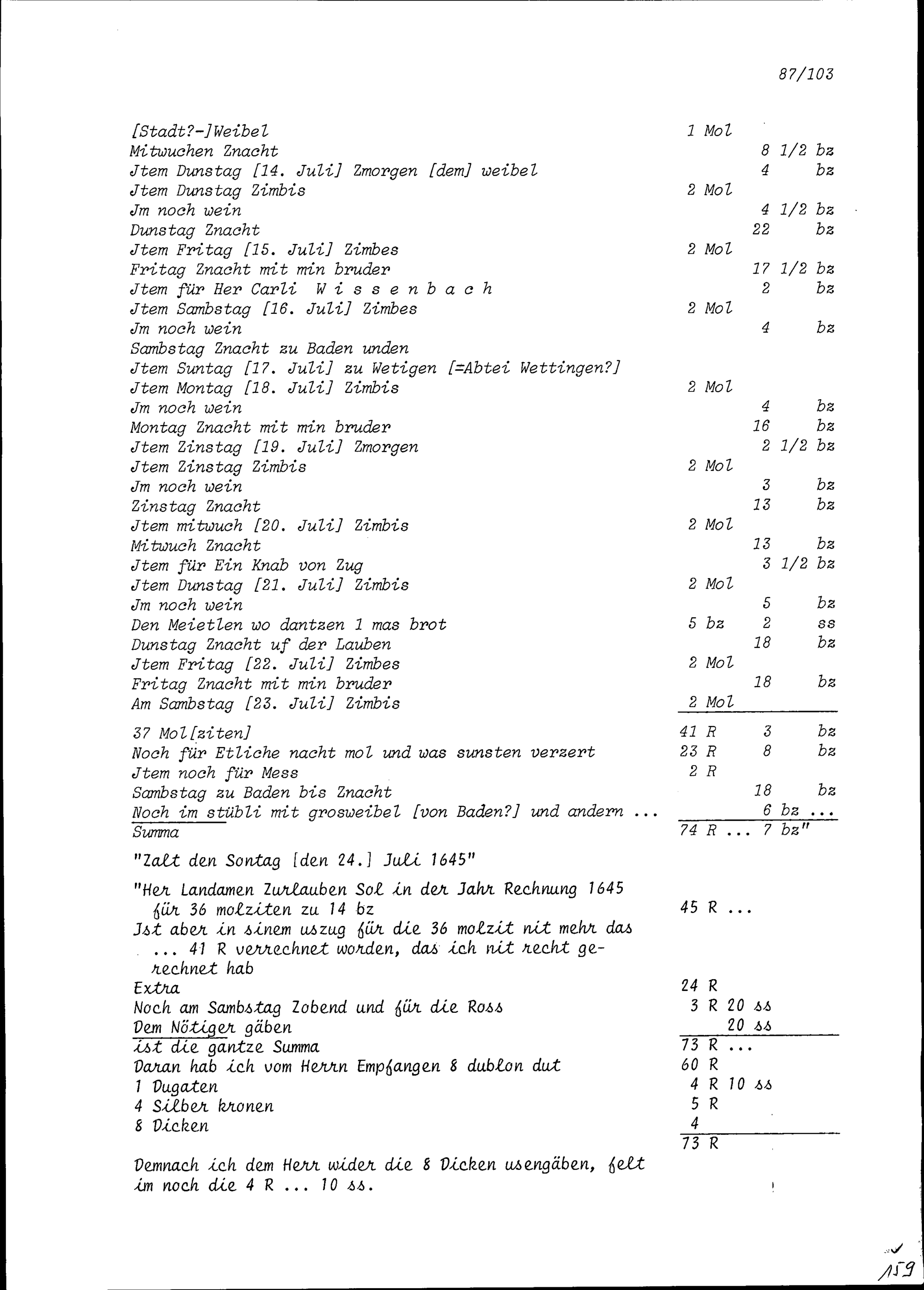 Rechnung für den Zuger Tagsatzungsgesandter an der Jahrrechnung in Baden, Beat II. Zurlauben, ausgestellt von Bernhard Wegmann, Engelwirt in Baden