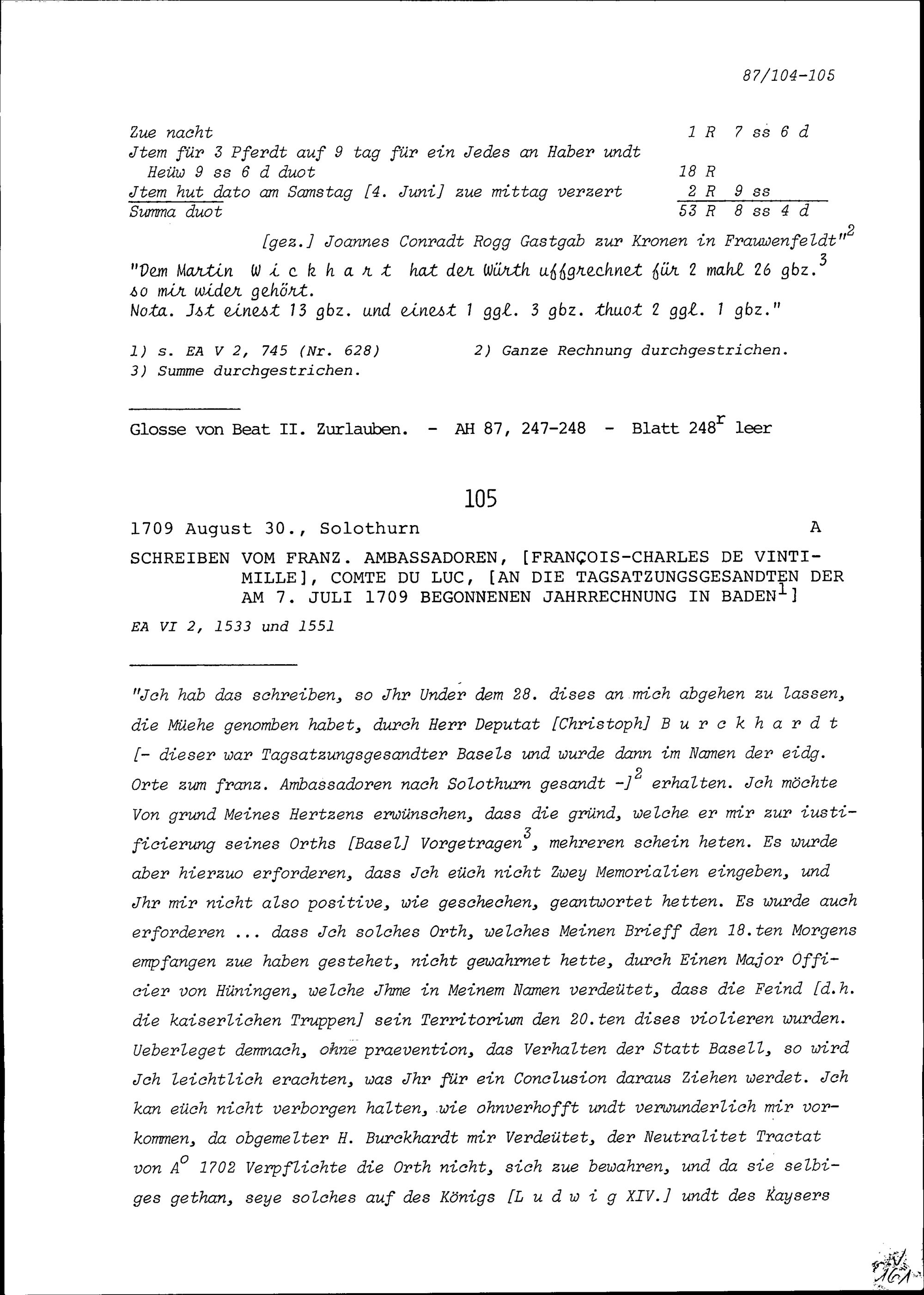 Schreiben von François-Charles de Vintimille, Graf du Luc, Ambassador von Frankeich, an die Tagsatzungsgesandten der am 7. Juli 1709 begonnenen Jahrrechnung in Baden