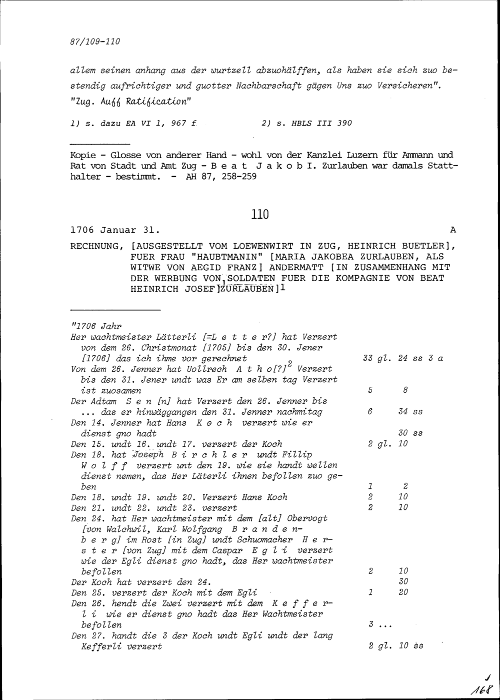Rechnung für Frau Maria Jakobea Zurlauben, Witwe von Ägid Franz Andermatt, in Zusammenhang mit der Werbung von Soldaten für die Kompanie von Beat Heinrich Josef Zurlauben, ausgestellt von Heinrich Bütler, Löwenwirt in Zug,
