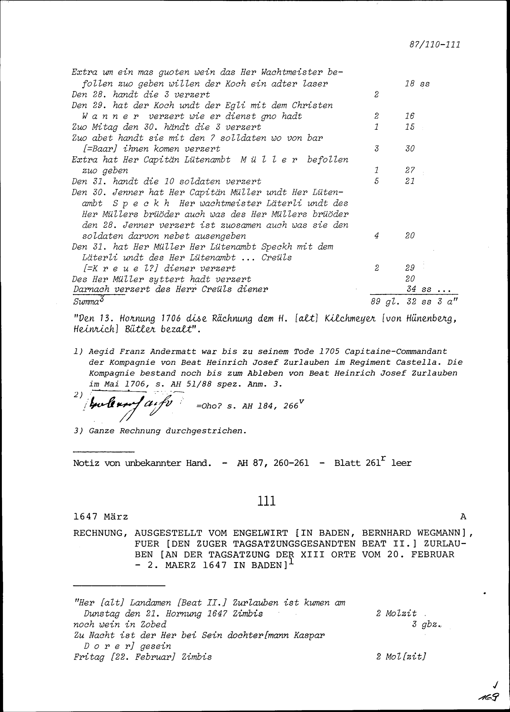 Rechnung für Beat II. Zurlauben, Tagsatzungsgesandter, ausgestellt von Bernhard Wegmann, Engelwirt in Baden