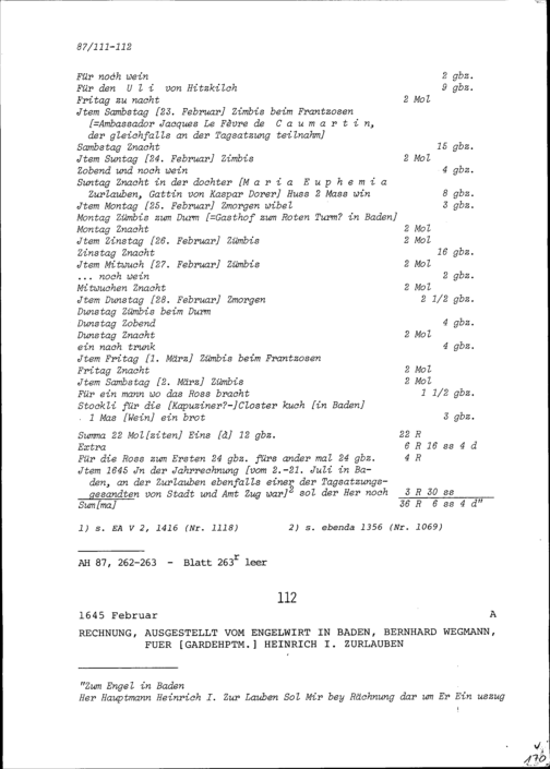 Rechnung für Heinrich I. Zurlauben, Gardehauptmann, ausgestellt von Bernhard Wegmann, Engelwirt in Baden