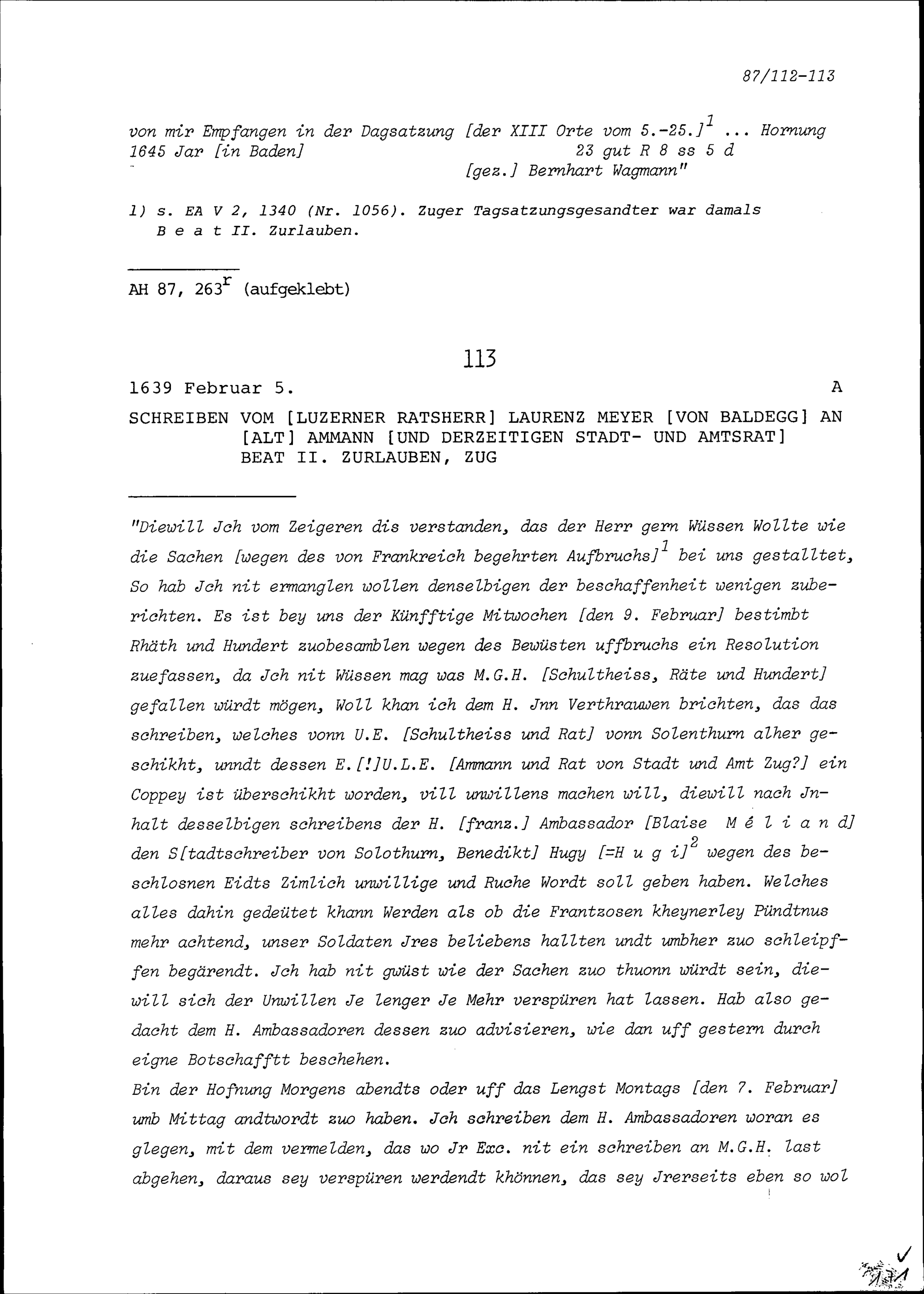 Schreiben von Laurenz Meyer von Baldegg, Luzerner Ratsherr, an Beat II. Zurlauben,...