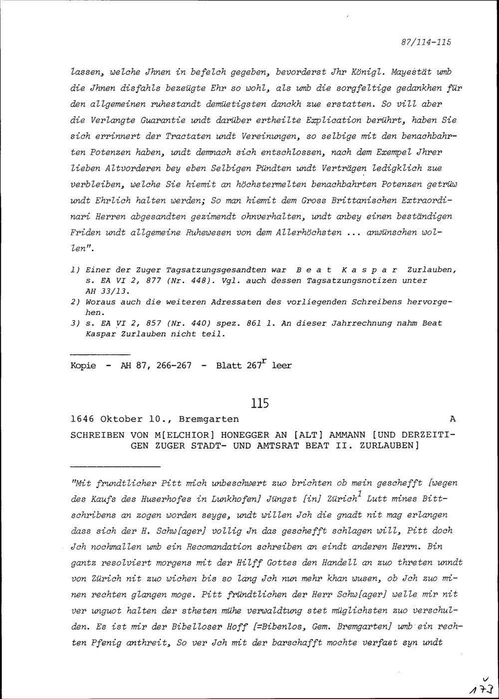 Schreiben von Melchior Honegger an Beat II. Zurlauben, Altammann und Stadt- und Amtrat Zug