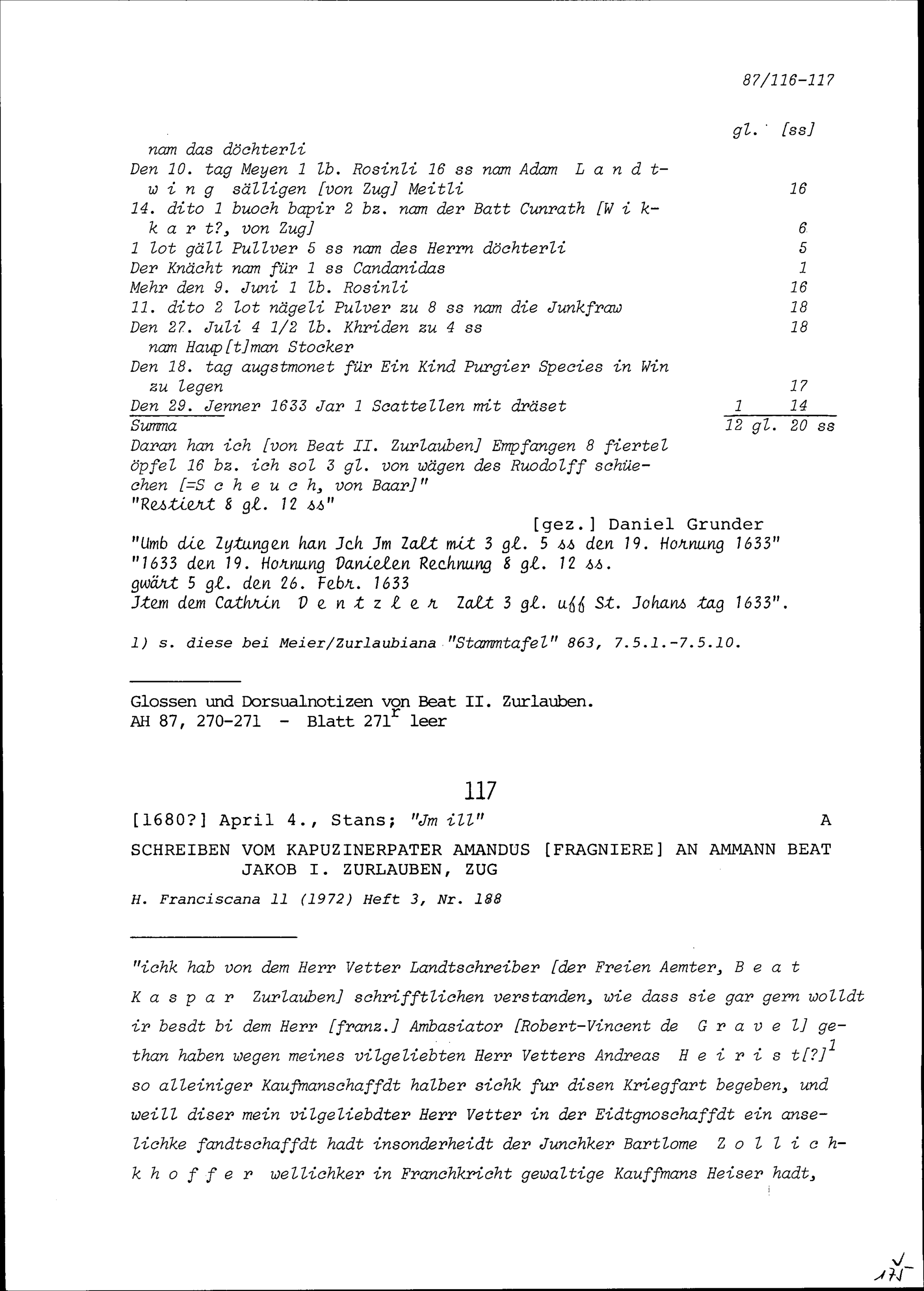 Schreiben von Amandus Frangière, Kapuzinerpater, an Beat Jakob I. Zurlauben, Ammann, Zug
