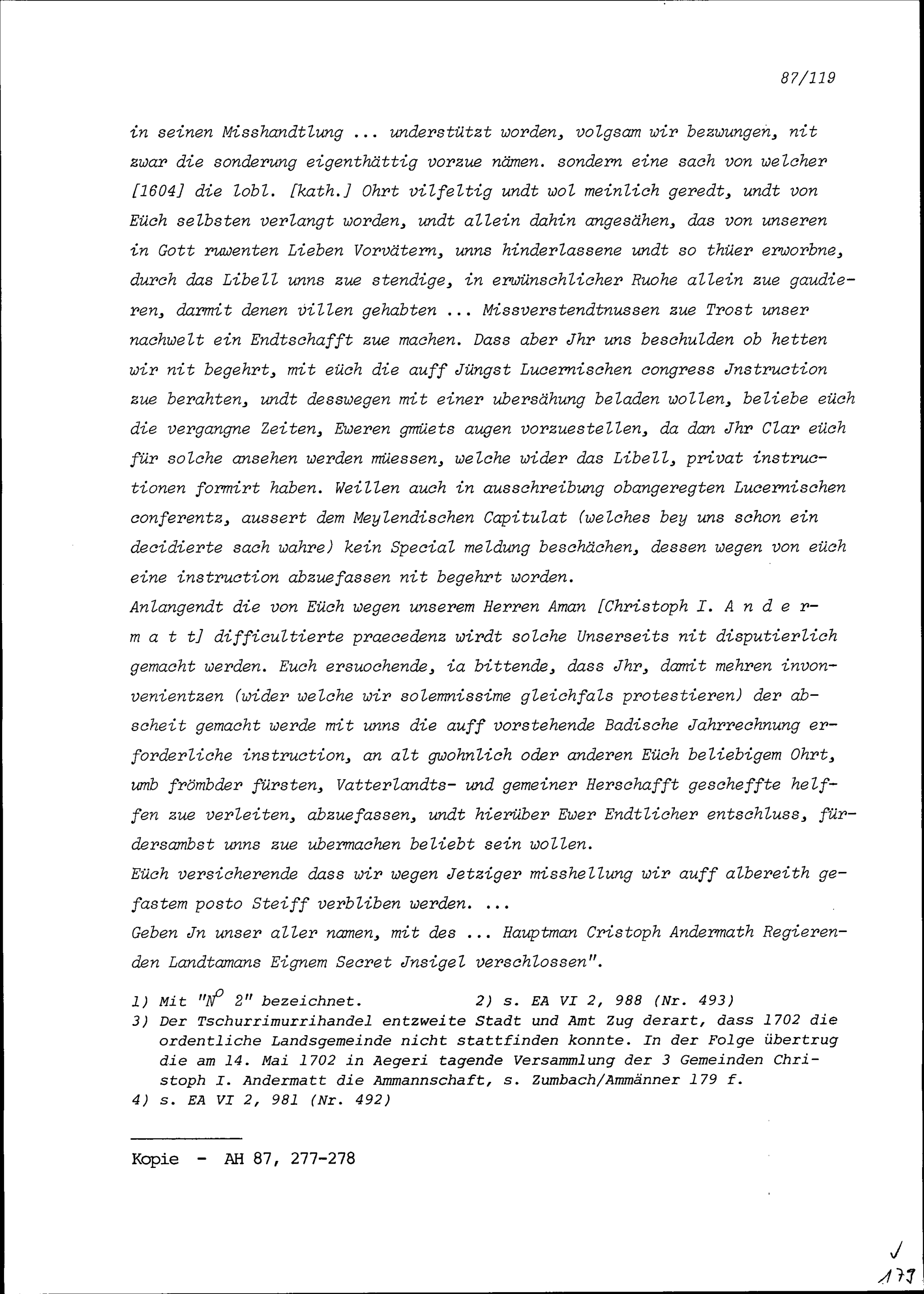 Schreiben der Ammänner und Räte des Äusseren Amts Zug an Altstatthalter und Rat der...