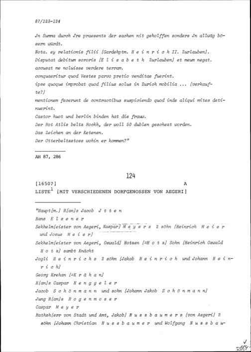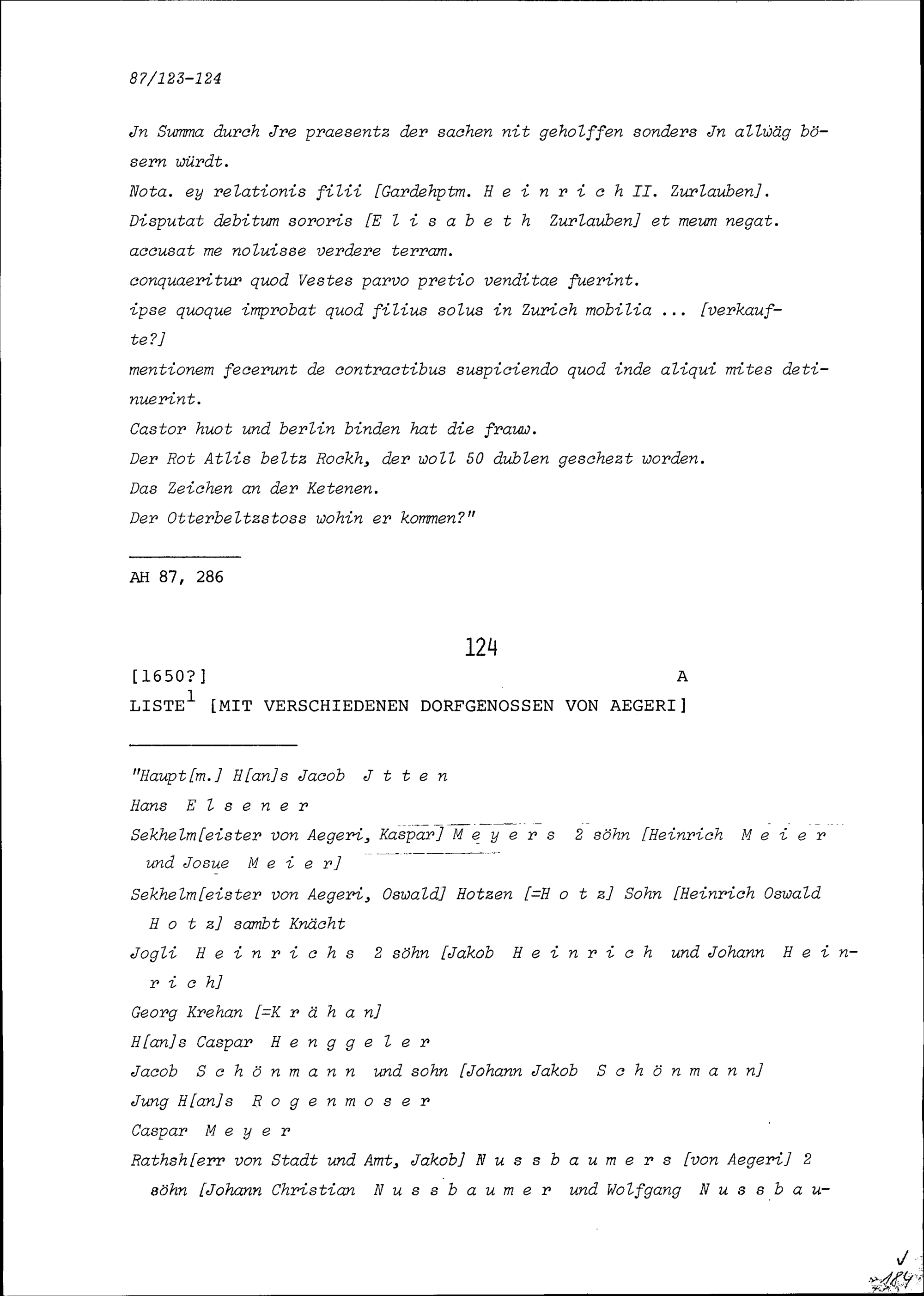 Pensionenliste mit verschiedenen Dorfgenossen von Ägeri