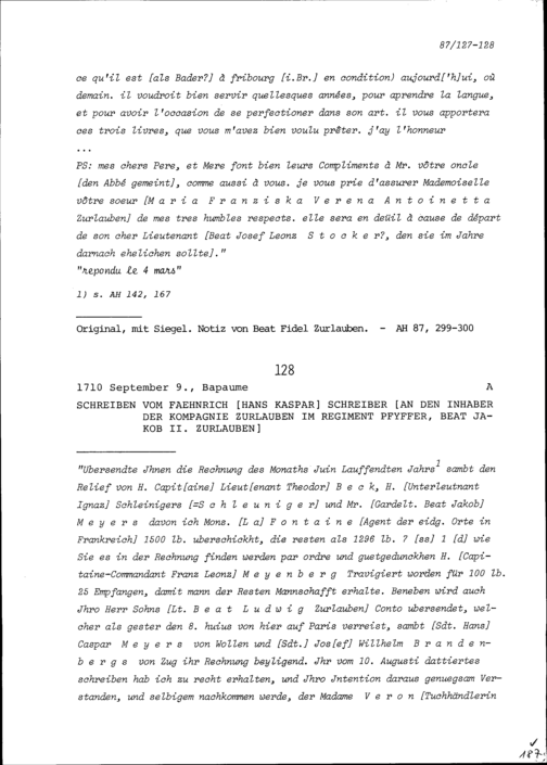 Schreiben von Hans Kaspar Schreiber, Fähnrich, an Beat Jakob II. Zurlauben, Inhaber der Kompanie Zurlauben im Regiment Pfyffer