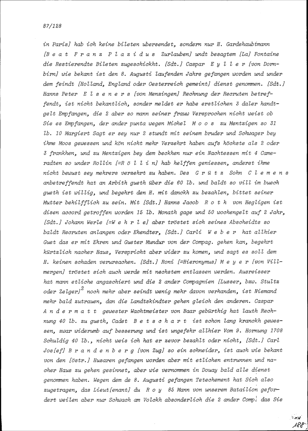 Schreiben von Hans Kaspar Schreiber, Fähnrich, an Beat Jakob II. Zurlauben, Inhaber der Kompanie Zurlauben im Regiment Pfyffer