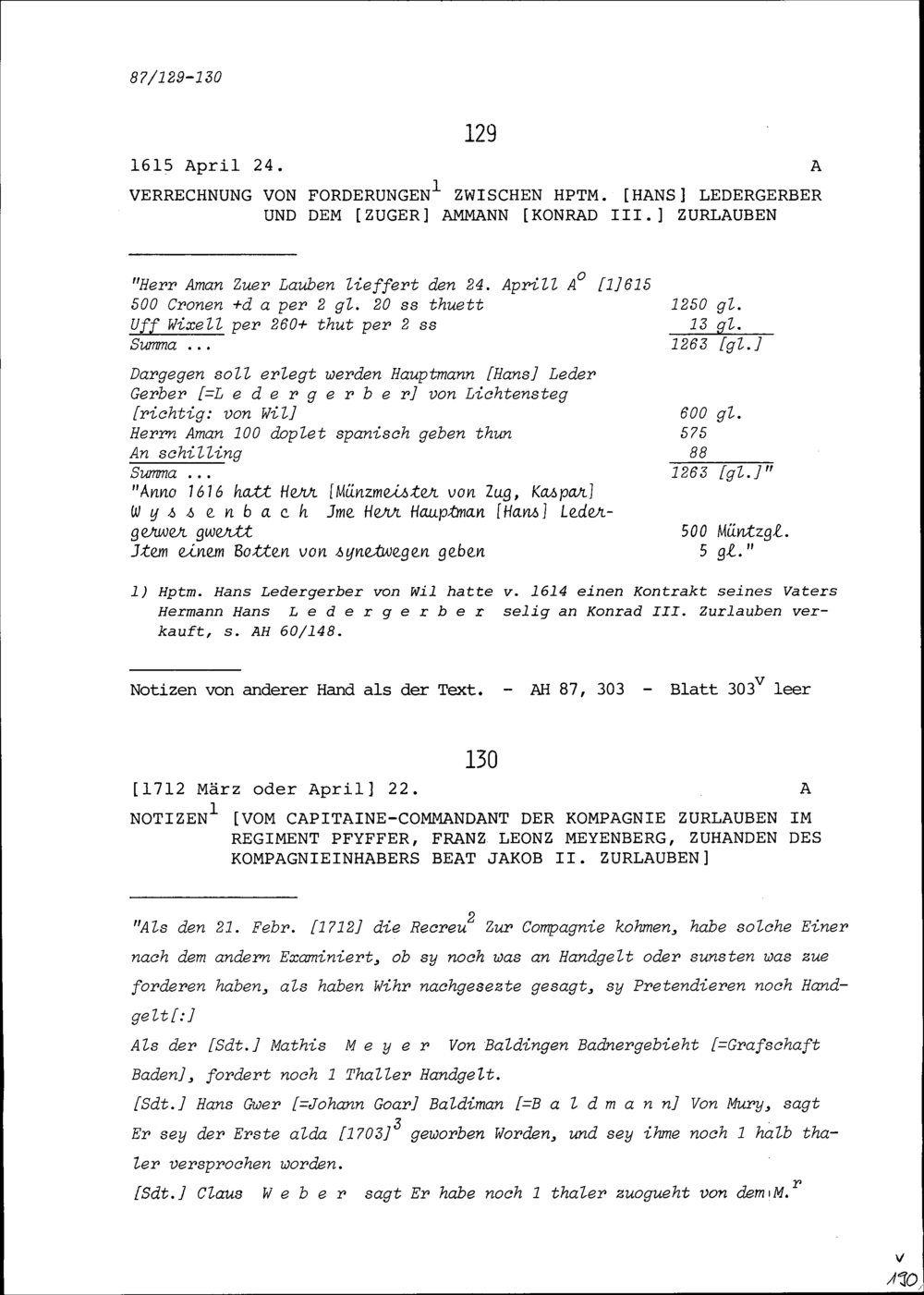 Verrechnung von Forderungen zwischen Hans Ledergerber, Hauptmann, und Konrad III. Zurlauben, Ammann Zug