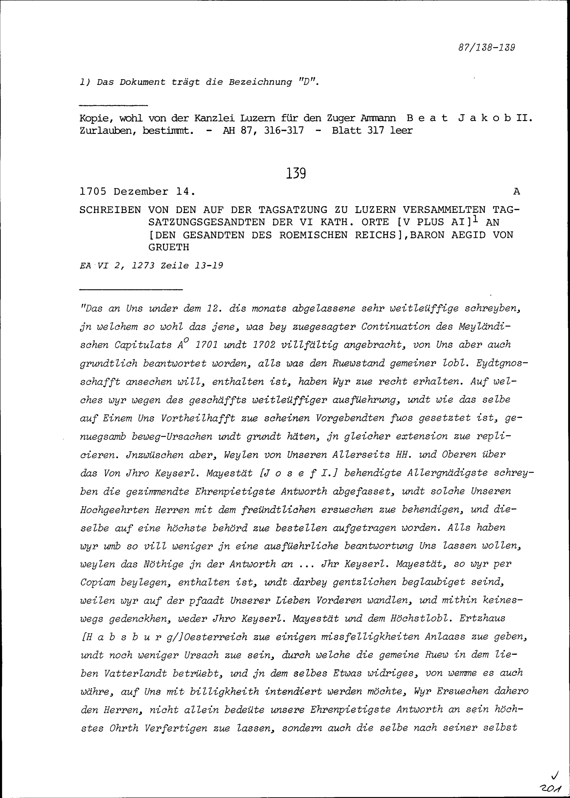Schreiben der Tagsatzungsgesandten der Sechs Katholischen Orte zu Luzern an Ägid von Grüth, Gesandter des Römischen Reichs,