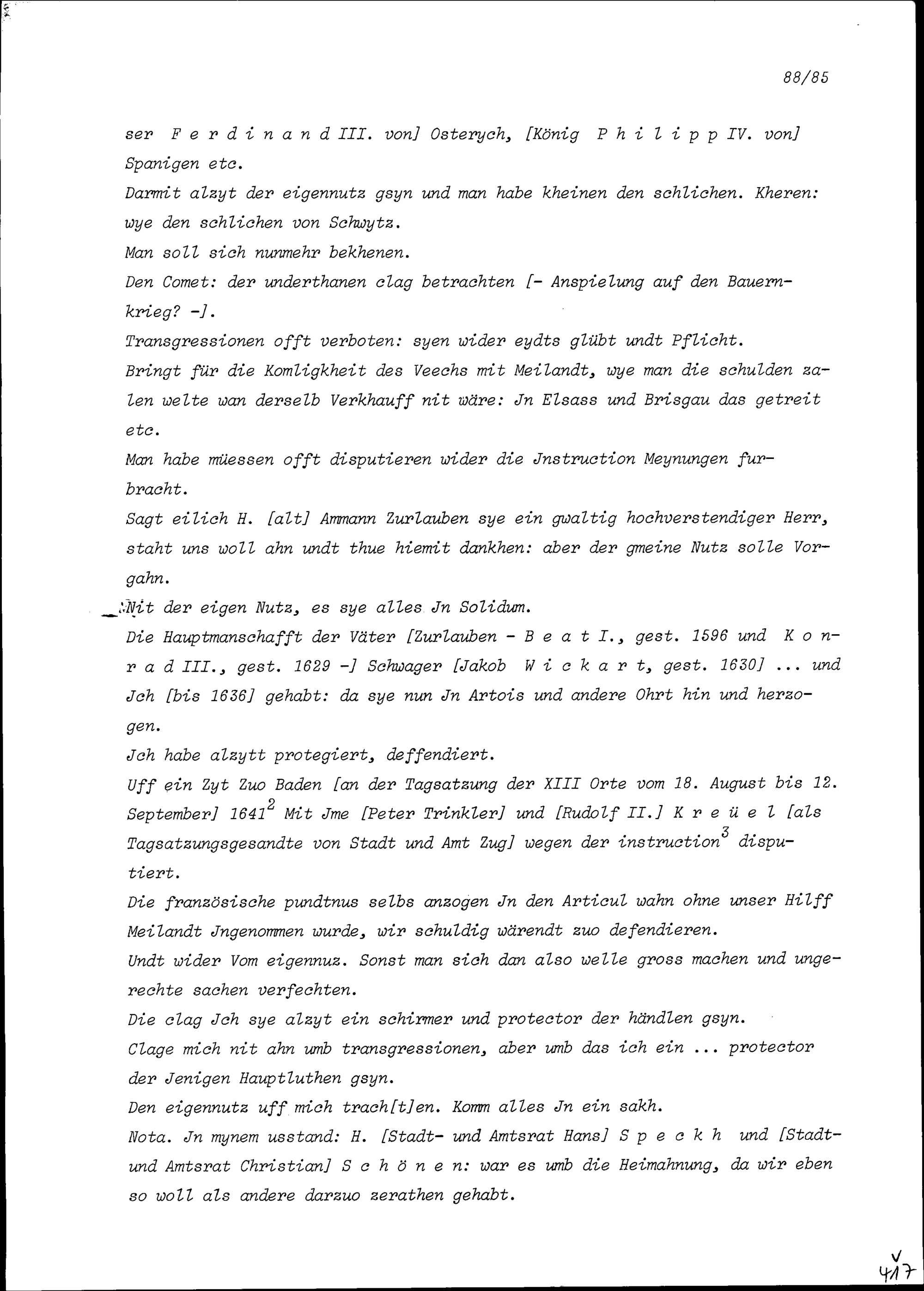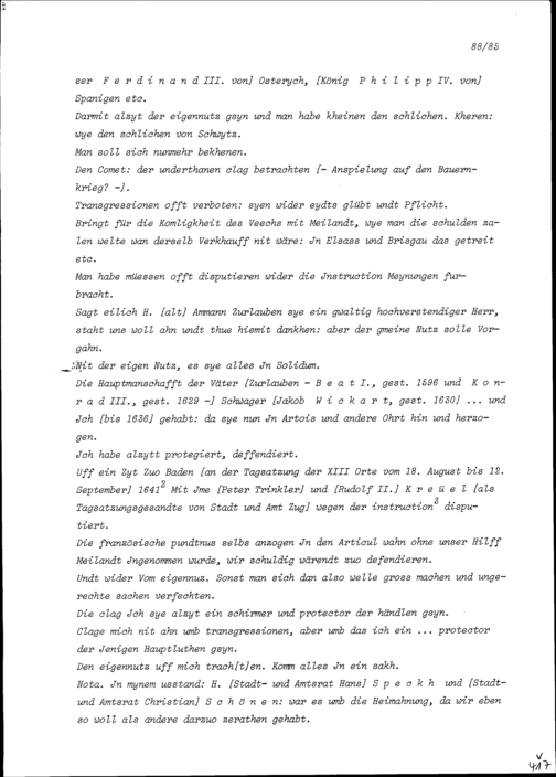 Notiz von Beat II. Zurlauben, Stadt- und Amtrat Zug, über die Stadt- und Amtratssitzung vom 12. Dezember 1653