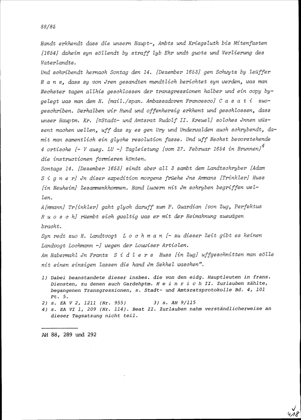 Notiz von Beat II. Zurlauben, Stadt- und Amtrat Zug, über die Stadt- und Amtratssitzung vom 12. Dezember 1653