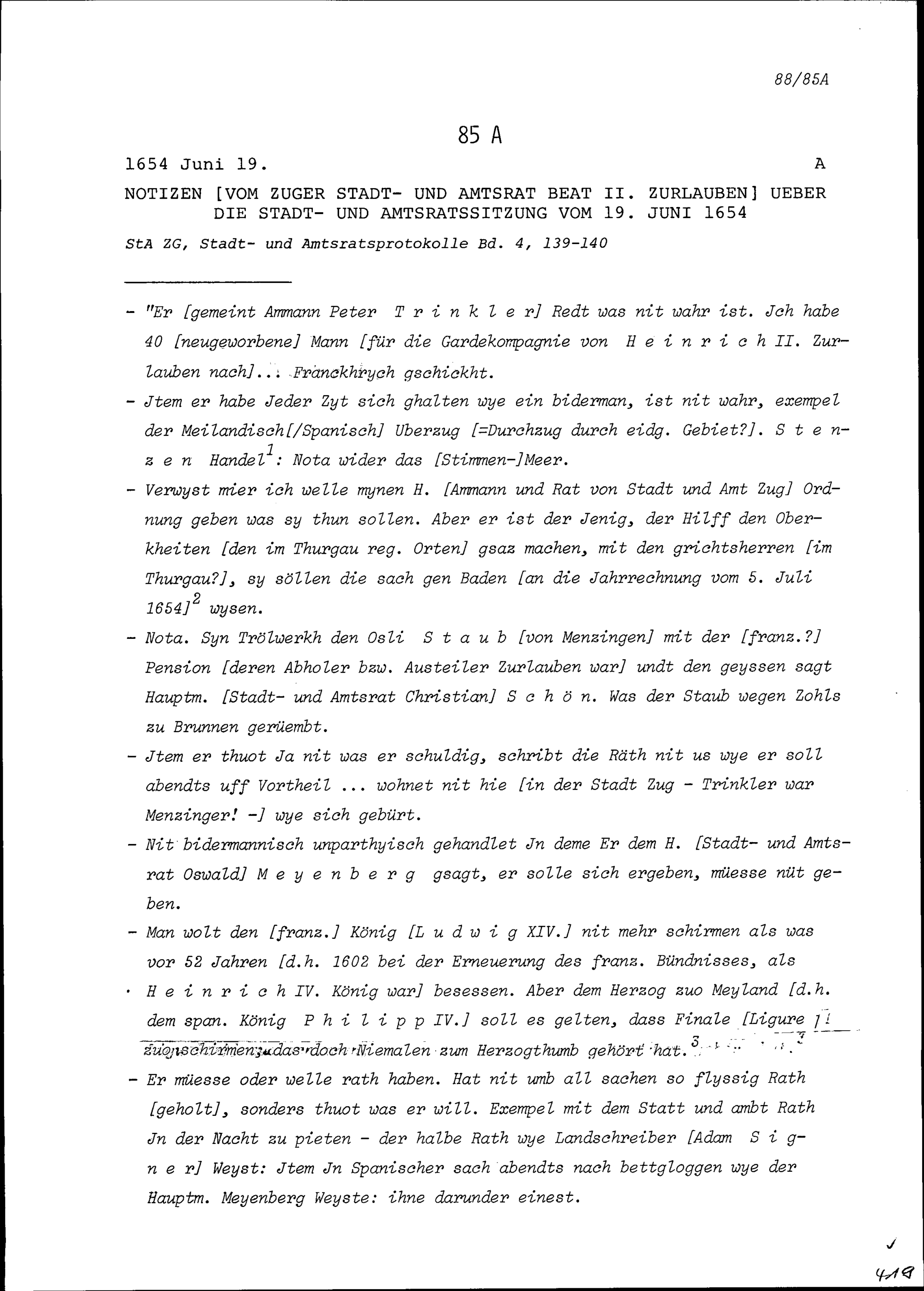 Notiz von Beat II. Zurlauben, Stadt- und Amtrat Zug, über die Stadt- und Amtratssitzung vom 19. Juni 1654