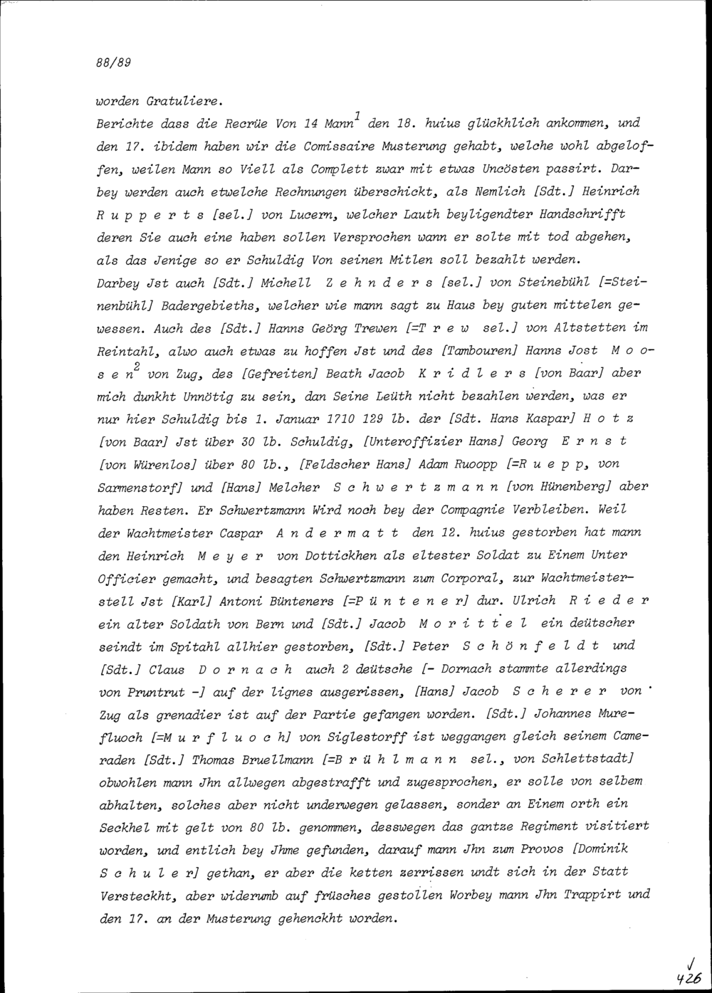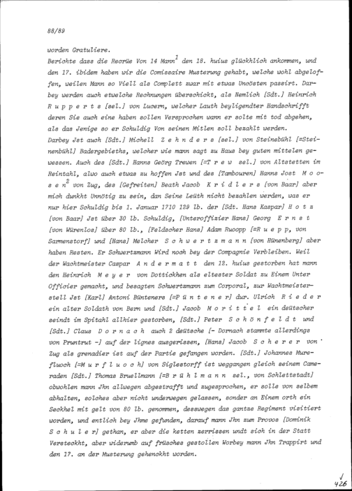 Schreiben von Hans Kaspar Schreiber, Fähnrich, an Beat Jakob II. Zurlauben, Inhaber der Kompanie Zurlauben im Regiment Pfyffer, Hauptmann, Altammann und Landmajor, Zug