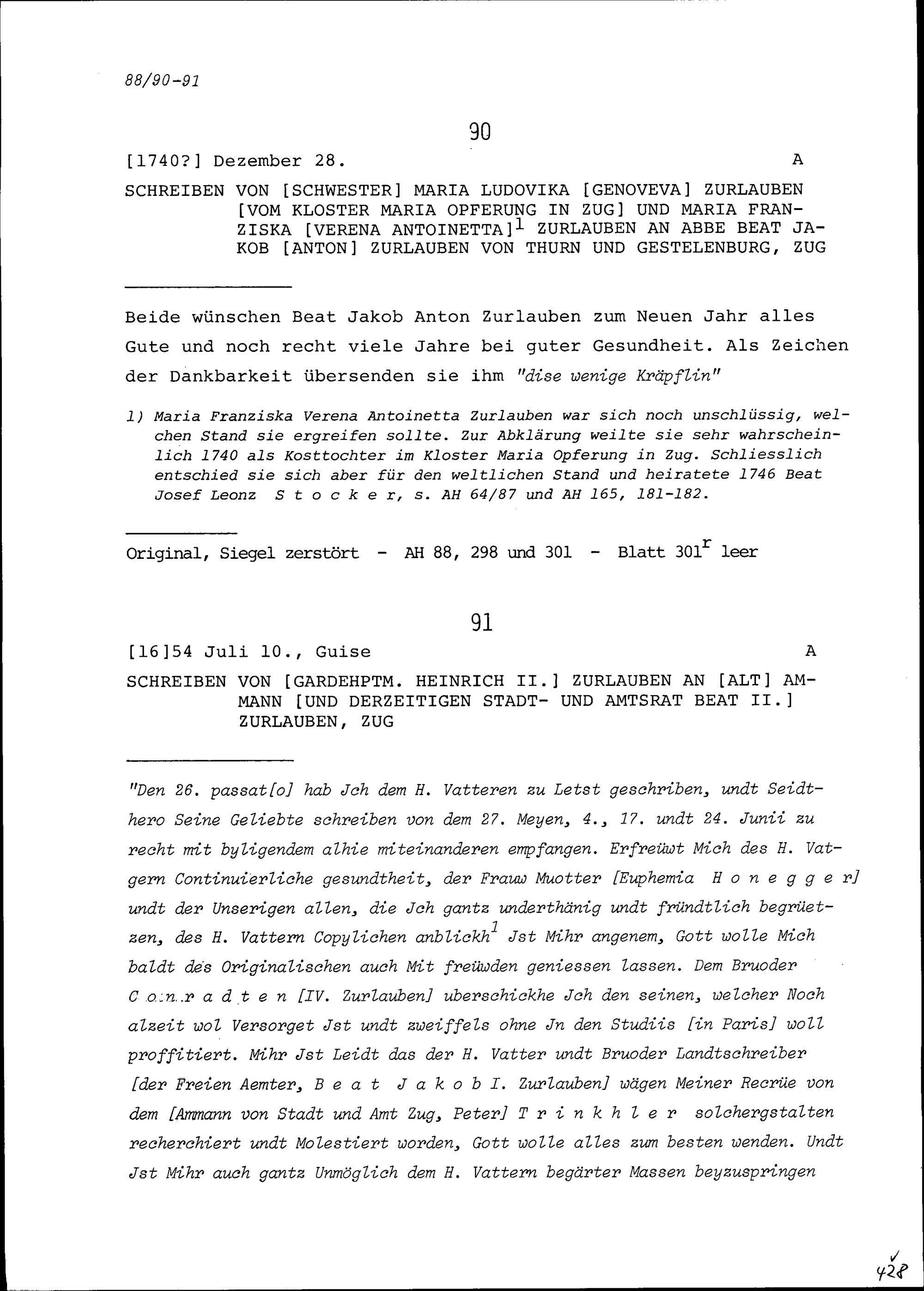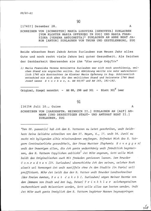 Schreiben von Maria Ludovika Genoveva Zurlauben, Klosterfrau im Kloster Maria Opferung in Zug, und von Maria Franziska Verena Antoinetta Zurlauben an Beat Jakob Anton Zurlauben, Priester, Zug