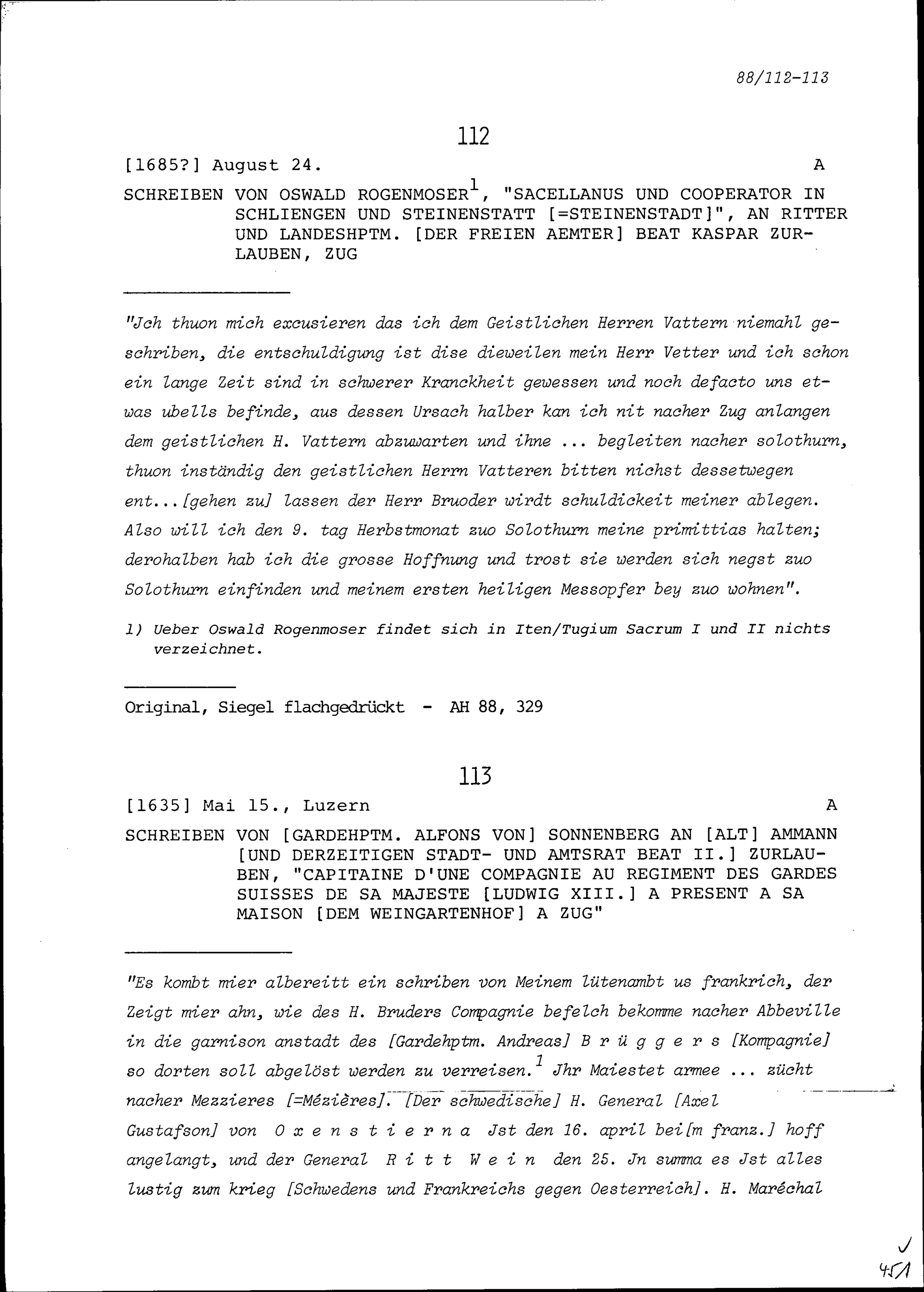 Schreiben von Oswald Rogenmoser, Kaplan und Kooperator in Schliengen und Steinenstadt, an Beat Kaspar Zurlauben, Landeshauptmann der Freien Ämter, Zug
