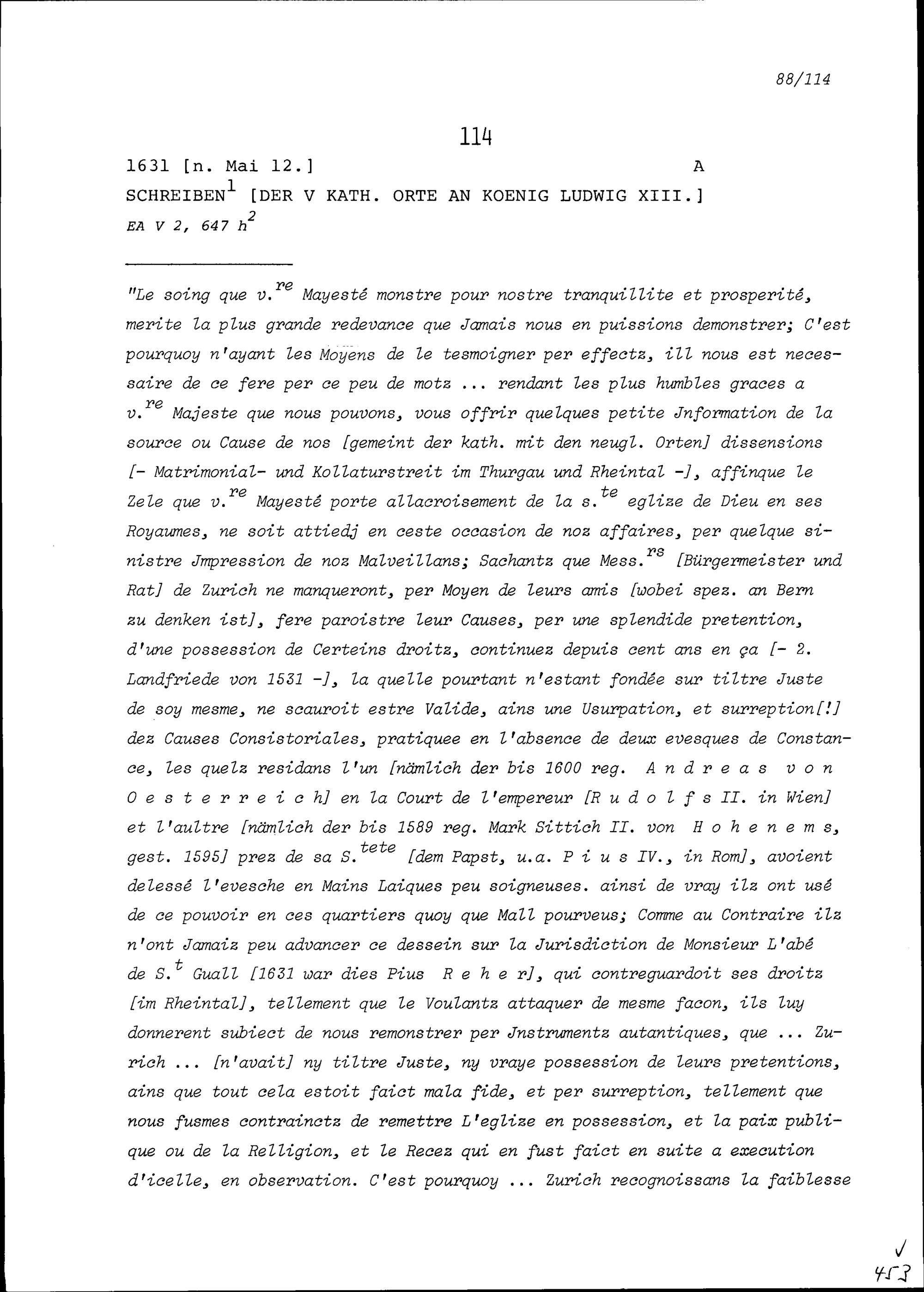 Schreiben der Fünf Katholischen Orte an Ludwig XIII., König von Frankreich