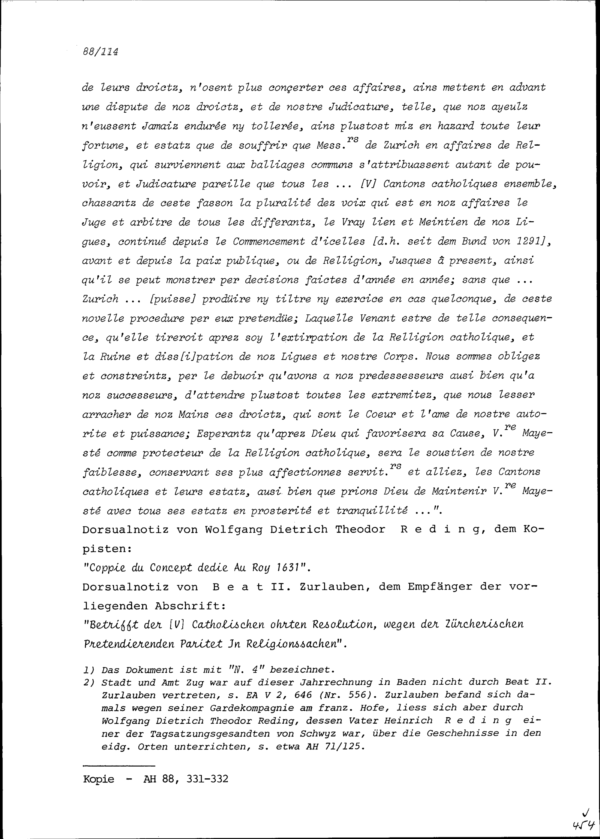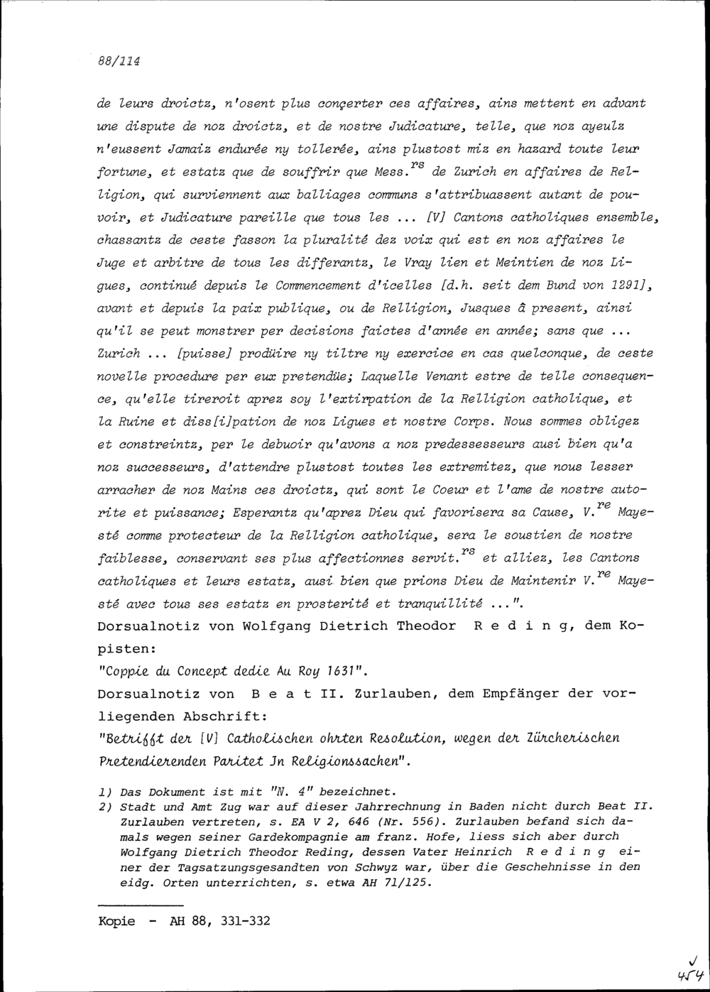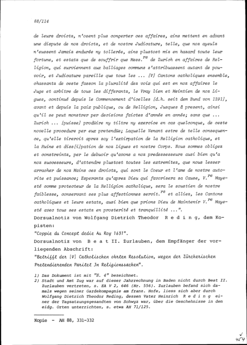 Schreiben der Fünf Katholischen Orte an Ludwig XIII., König von Frankreich