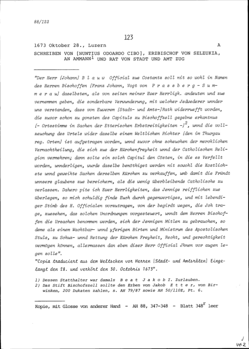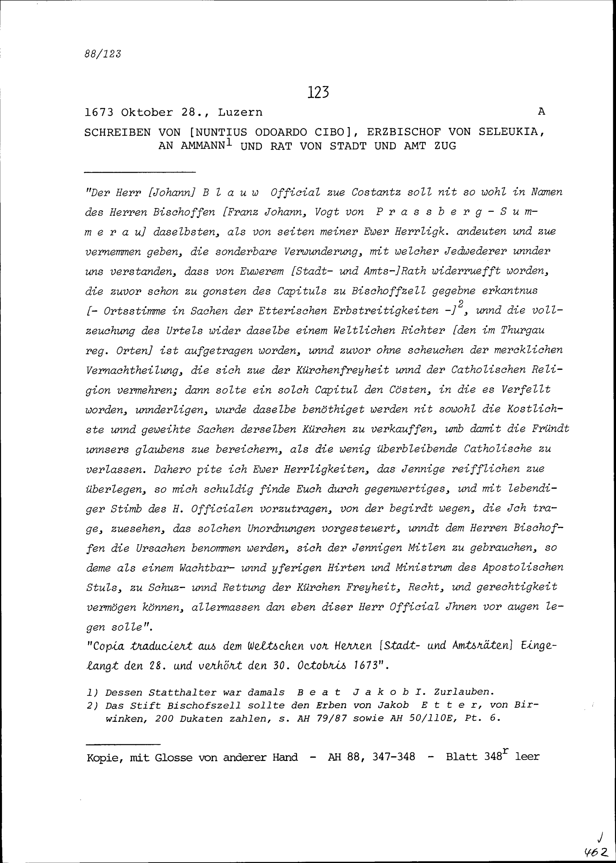 Schreiben von Odoardo Cibo, Nuntius und Erzbischof von Seleukia, an Ammann und Rat...