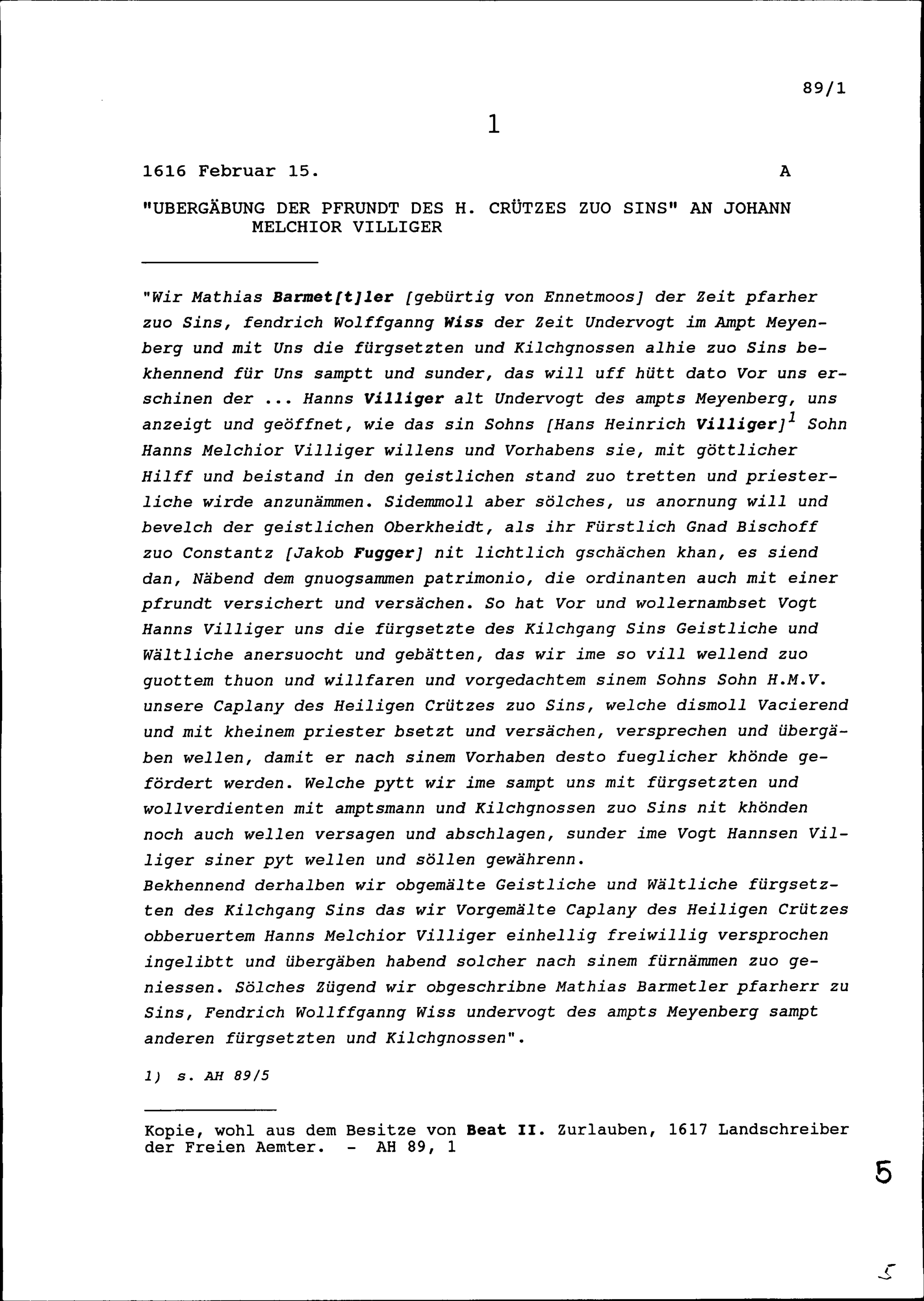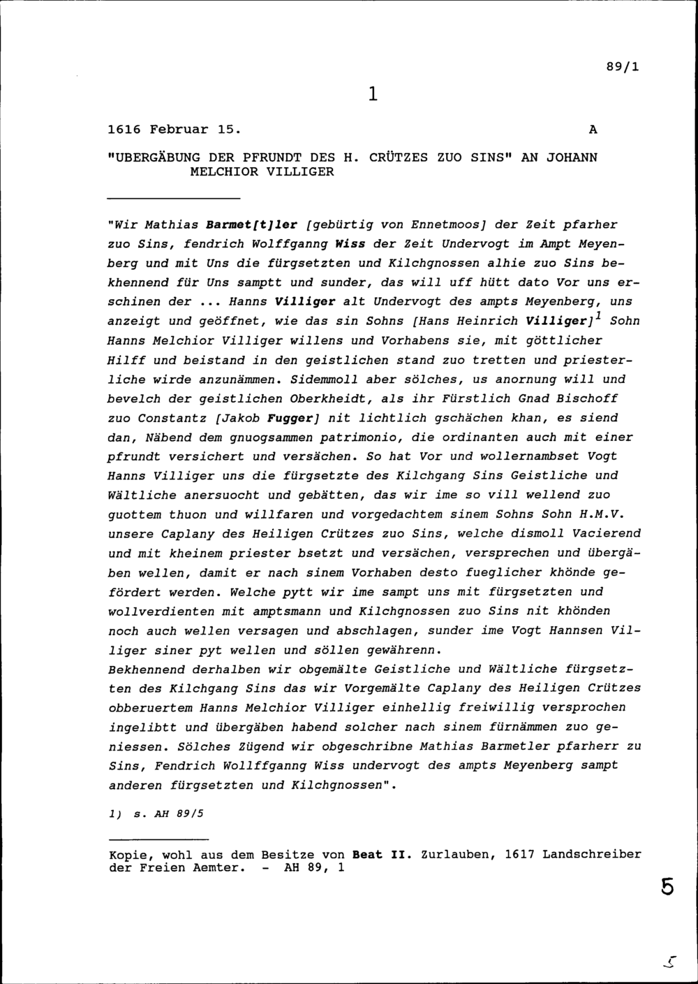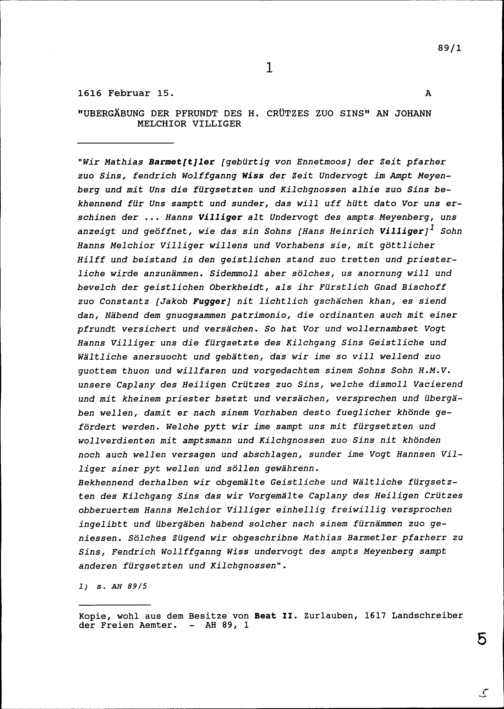 Übergabe der Pfrund des Heiligen Kreuzes in Sins an Johann Melchior Villiger