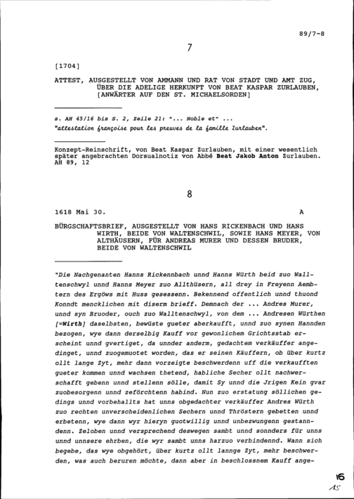 Attest über die adelige Herkunft von Beat Kaspar Zurlauben, Anwärter auf den Sankt Michaelsorden, ausgestellt von Ammann und Rat von Stadt und Amt Zug