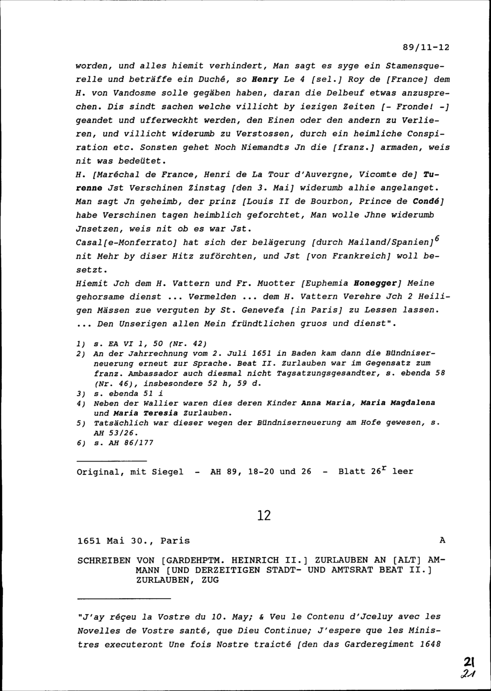 Schreiben von Heinrich II. Zurlauben, Gardehauptmann, an Beat II. Zurlauben, Altammann und Stadt- und Amtrat, Zug