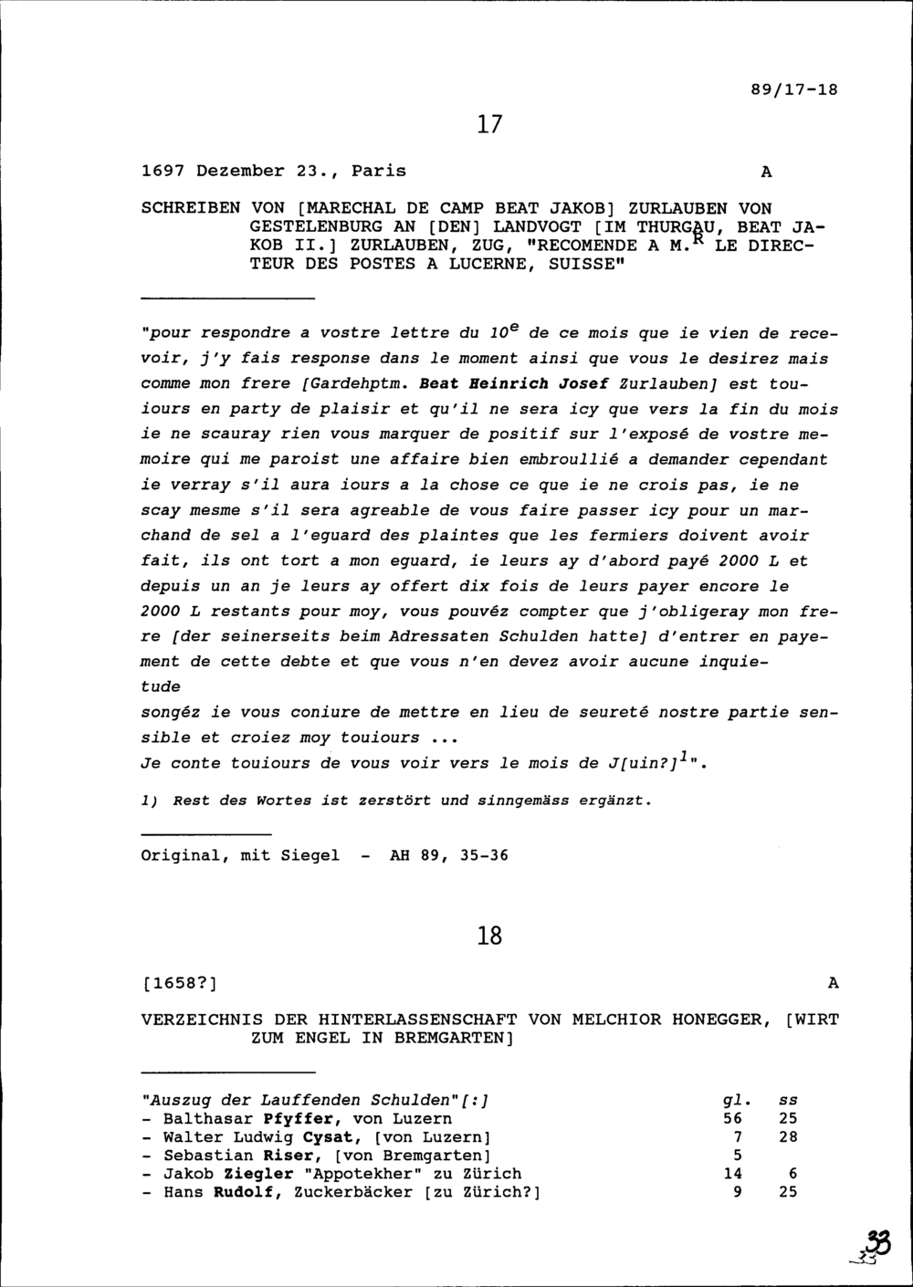 Schreiben von Beat Jakob Zurlauben, Feldmarschall, an Beat Jakob II. Zurlauben, Landvogt im Thurgau, Zug