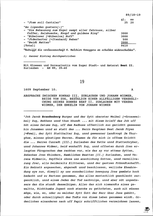 Absprache zwischen Konrad III. Zurlauben und Johann Widmer, beide von Zug, bezüglich einer allfälligen Verehelichung seines Sohns Beat II. Zurlauben mit Verena Widmer, der Enkelin von Johann Widmer