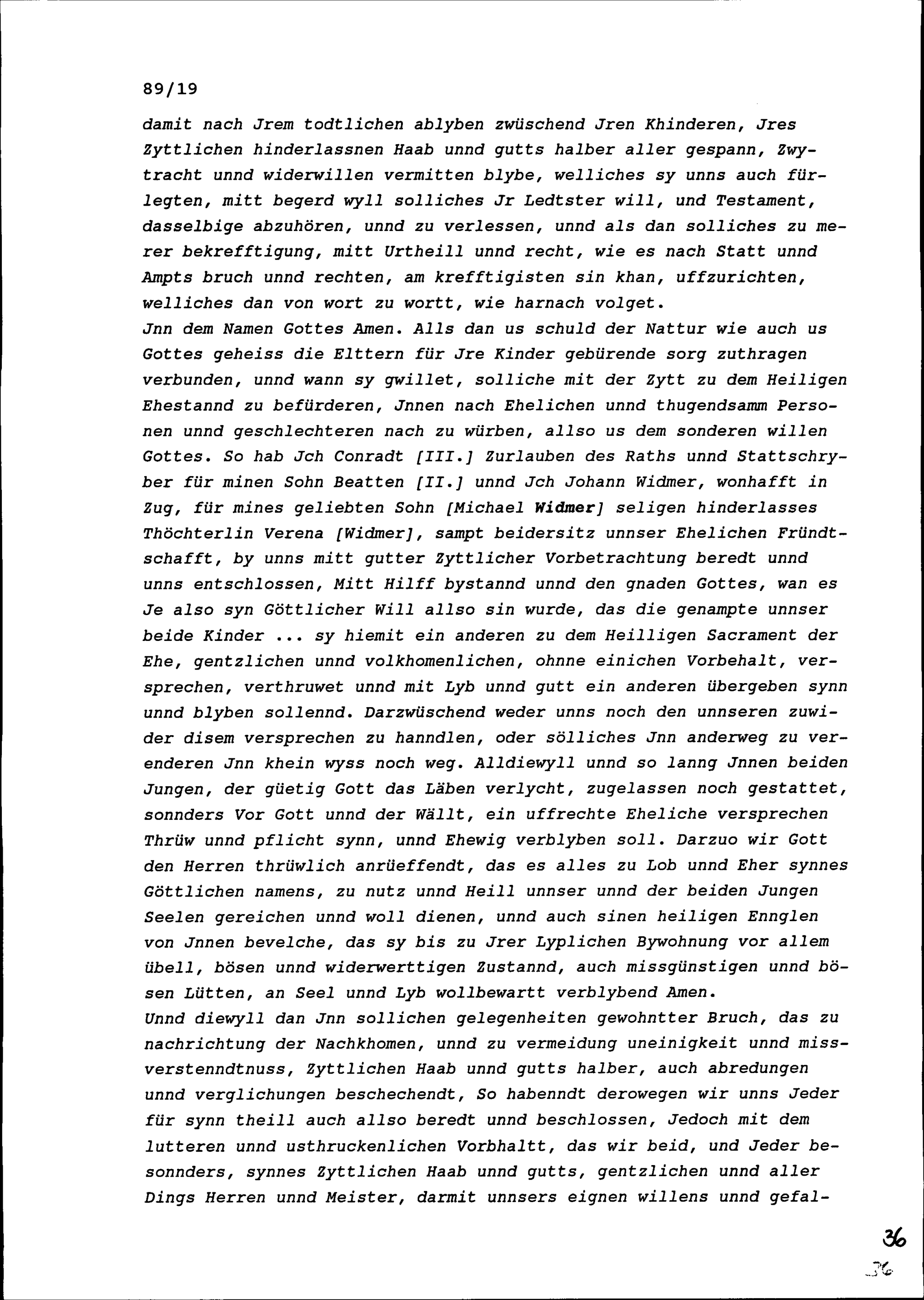 Absprache zwischen Konrad III. Zurlauben und Johann Widmer, beide von Zug, bezüglich einer allfälligen Verehelichung seines Sohns Beat II. Zurlauben mit Verena Widmer, der Enkelin von Johann Widmer