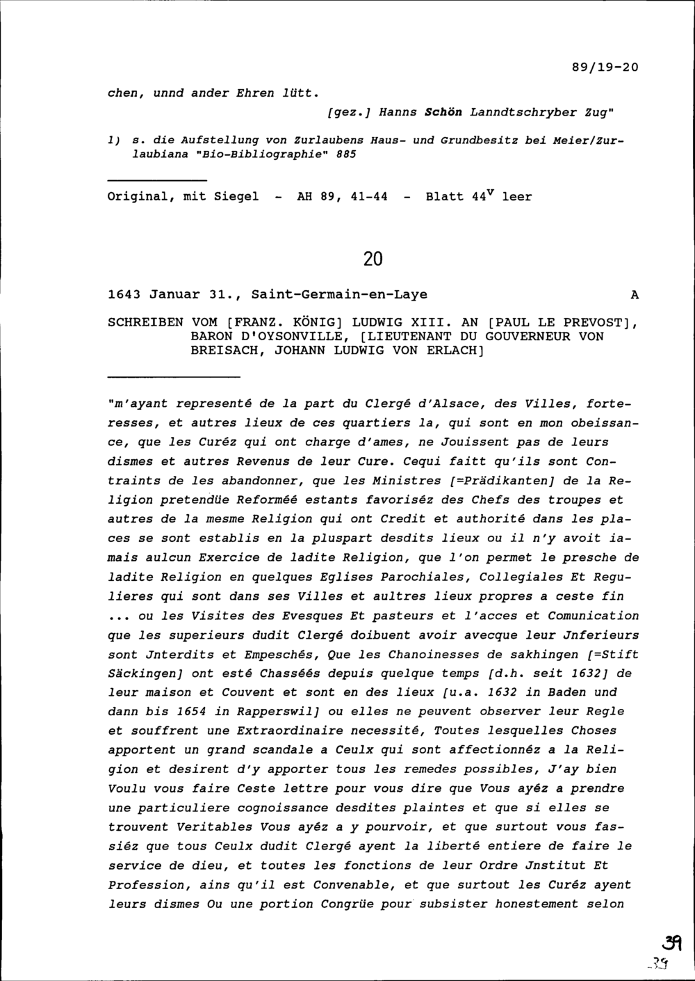 Schreiben von Ludwig XIII., König von Frankreich, an Paul Le Prevost, Baron d'Oysonville, Leutnant von Johann Ludwig von Erlach, Gouverneur von Breisach